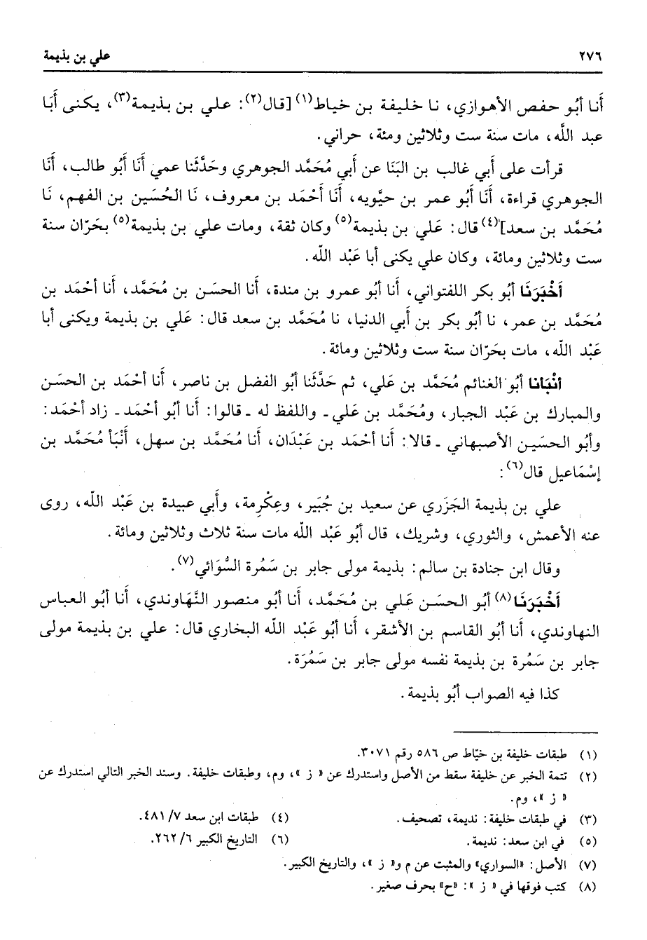 أنا أبو حفص الأهوازي نا خليفة بن خياط (1) قال (2) علي بن بذيمة (3) يكنى أبا عبد الله مات سنة ست وثلاثين ومئة حراني قرأت على أبي غالب بن البنا عن أبي محمد الجوهري وحدثنا عمي نا أبو طالب أنا الجوهري قراءة أنا أبو عمر بن حيوية أنا أحمد بن معروف نا الحسين بن الفهم نا محمد بن سعد (4) قال علي بن بذيمة وكان ثقة ومات علي بن بذيمة (5) بحران سنة ست وثلاثين ومائة وكان علي يكنى أبا عبد الله أخبرنا أبو بكر اللفتواني أنا أبو عمرو بن مندة أنا الحسن بن محمد أنا أحمد بن محمد بن عمر نا أبو بكر بن ابي الدنيا نا محمد بن سعد قال علي بن بذيمة ويكنى أبا عبد الله مات بحران سنة ست وثلاثين ومائة أنبأنا أبو الغنائم محمد بن علي ثم حدثنا أبو الفضل بن ناصر أنا أحمد بن الحسن والمبارك بن عبد الجبار ومحمد بن علي واللفظ له قالوا أنا أبو أحمد زاد أحمد وأبو الحسين الأصبهاني قالا أنا أحمد بن عبدان أنا محمد بن سهل أنبأ محمد بن إسماعيل قال (6) علي بن بذيمة الجزري عن سعيد بن جبير وعكرمة وأبي عبيدة بن عبد الله روى عنه الأعمش والثوري وشريك قال أبو عبد الله مات سنة ثلاث وثلاثين ومائة وقال ابن جنادة بن سالم بذيمة مولى جابر بن سمرة السوائي (7) أخبرنا (8) أبو الحسن علي بن محمد أنا أبو منصور النهاوندي أنا أبو العباس النهاوندي أنا أبو القاسم بن الأشقر أنا أبو عبد الله البخاري قال علي بن بذيمة مولى جابر بن سمرة بن بذيمة نفسه مولى جابر بن سمرة كذا فيه الصواب أبو بذيمة