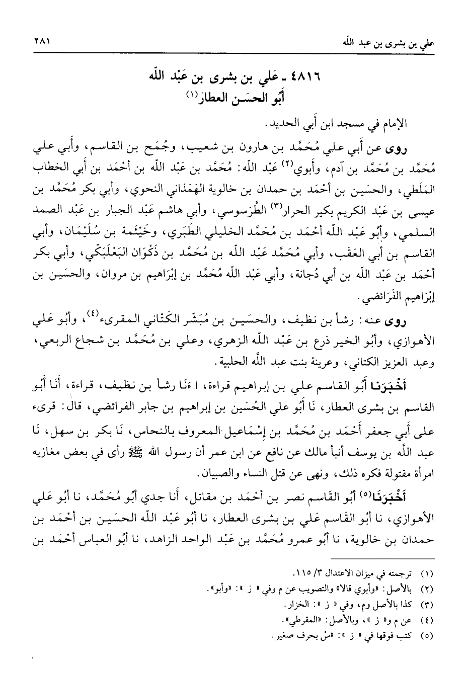4816 - علي بن بشرى بن عبد الله أبو الحسن العطار (1) الإمام في مسجد ابن أبي الحديد روى عن أبي علي محمد بن هارون بن شعيب وجمح بن القاسم وأبي علي محمد بن محمد بن آدم وأبوي (2) عبد الله محمد بن عبد الله بن أحمد بن أبي الخطاب الملطي والحسين بن أحمد بن حمدان بن خالوية الهمذاني النحوي وأبي بكر محمد بن عيسى بن عبد الكريم بكير الحرار (3) الطرسوسي وأبي هاشم عبد الجبار بن عبد الصمد السلمي وأبو عبد الله أحمد بن محمد الخليلي الطبري وخيثمة بن سليمان وأبي القاسم بن أبي العقب وأبي محمد عبد الله بن محمد بن ذكوان البعلبكي وأبي بكر أحمد بن عبد الله بن أبي دجانة وأبي عبد الله محمد بن إبراهيم بن مروان والحسين بن إبراهيم الفرائضي روى عنه رشأ بن نظيف والحسين بن مبشر الكتاني المقرئ (4) وأبو علي الأهوازي وأبو الخير ذرع بن عبد الله الزهري وعلي بن محمد بن شجاع الربعي وعبد العزيز الكتاني وعرينة بنت عبد الله الحلبية أخبرنا أبو القاسم علي بن إبراهيم قراءة أنا رشأ بن نظيف قراءة أنا أبو القاسم بن بشرى العطار نا أبو علي الحسين بن إبراهيم بن جابر الفرائضي قال قرئ على أبي جعفر أحمد بن محمد بن إسماعيل المعروف بالنحاس نا بكر بن سهل نا عبد الله بن يوسف أنبأ مالك عن نافع عن ابن عمر أن رسول الله (صلى الله عليه وسلم) رأى في بعض مغازيه امرأة مقتولة فكره ذلك ونهى عن قتل النساء والصبيان أخبرنا (5) أبو القاسم نصر بن أحمد بن مقاتل أنا جدي أبو محمد نا أبو علي الأهوازي نا أبو القاسم علي بن بشرى العطار نا أبو عبد الله الحسين بن أحمد بن حمدان بن خالوية نا أبو عمرو محمد بن عبد الواحد الزاهد نا أبو العباس أحمد بن