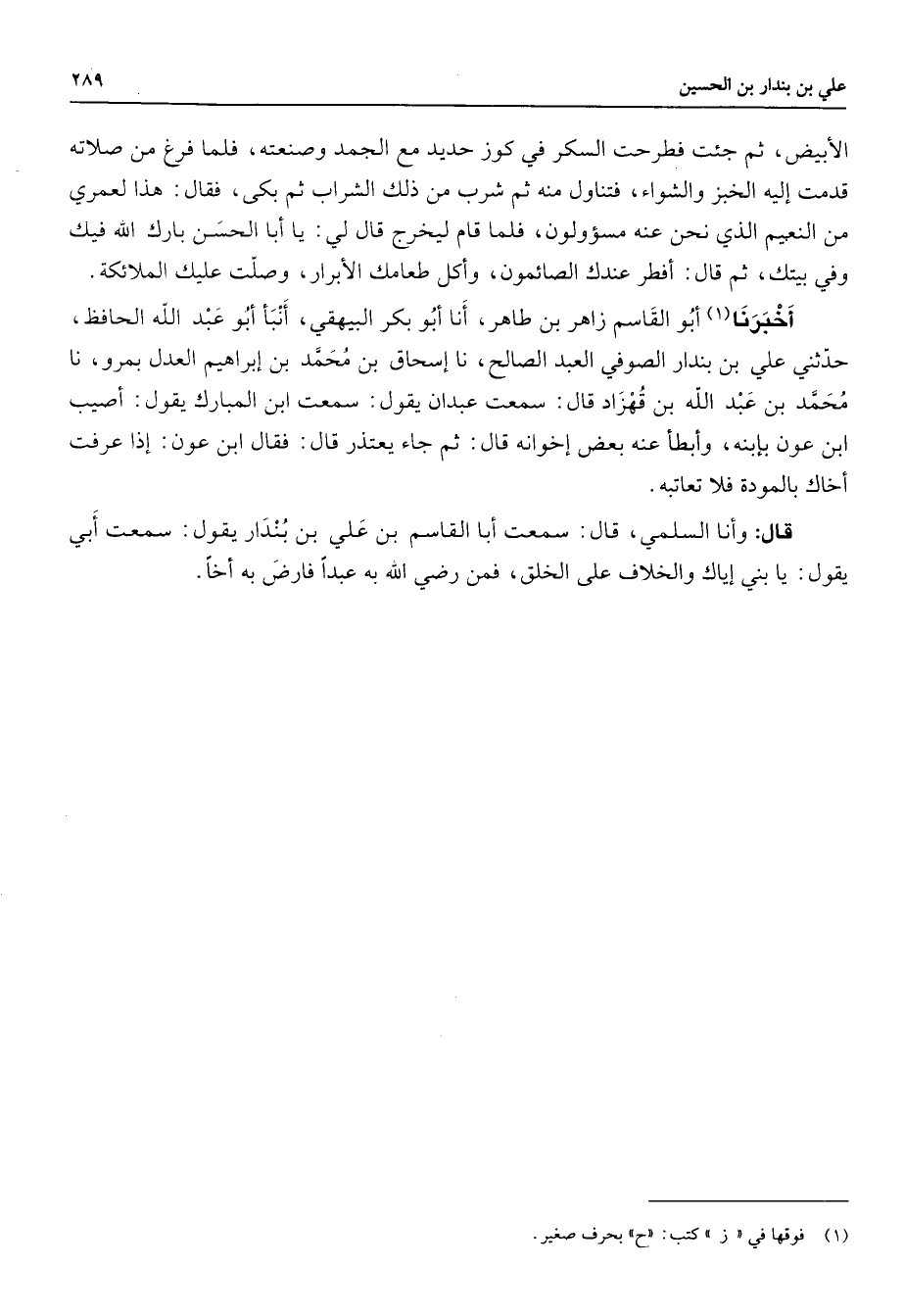 الأبيض ثم جئت فطرحت السكر في كوز حديد مع الجمد وصنعته فلما فرغ من صلاته قدمت إليه الخبز والشواء فتناول منه ثم شرب من ذلك الشراب ثم بكى فقال هذا لعمري من النعيم الذي نحن عنه مسؤولون فلما قام ليخرج قال لي يا أبا الحسن بارك الله فيك وفي بيتك ثم قال أفطر عندك الصائمون وأكل طعامك الأبرار وصلت عليك الملائكة أخبرنا (1) أبو القاسم زاهر بن طاهر أنا أبو بكر البيهقي أنبأ أبو عبد الله الحافظ حدثني علي بن بندار الصوفي العبد الصالح نا إسحاق بن محمد بن إبراهيم العدل بمرو نا محمد بن عبد الله بن قهزاد قال سمعت عبدان يقول سمعت ابن المبارك يقول أصيب ابن عون بإبنه وأبطأ عنه بعض إخوانه قال ثم جاء يعتذر قال فقال ابن عون إذا عرفت أخاك بالمودة فلا تعاتبه قال وأنا السلمي قال سمعت أبا القاسم بن علي بن بندار يقول سمعت أبي يقول يا بني إياك والخلاف على الخلق فمن رضي الله به عبدا فارض به أخا