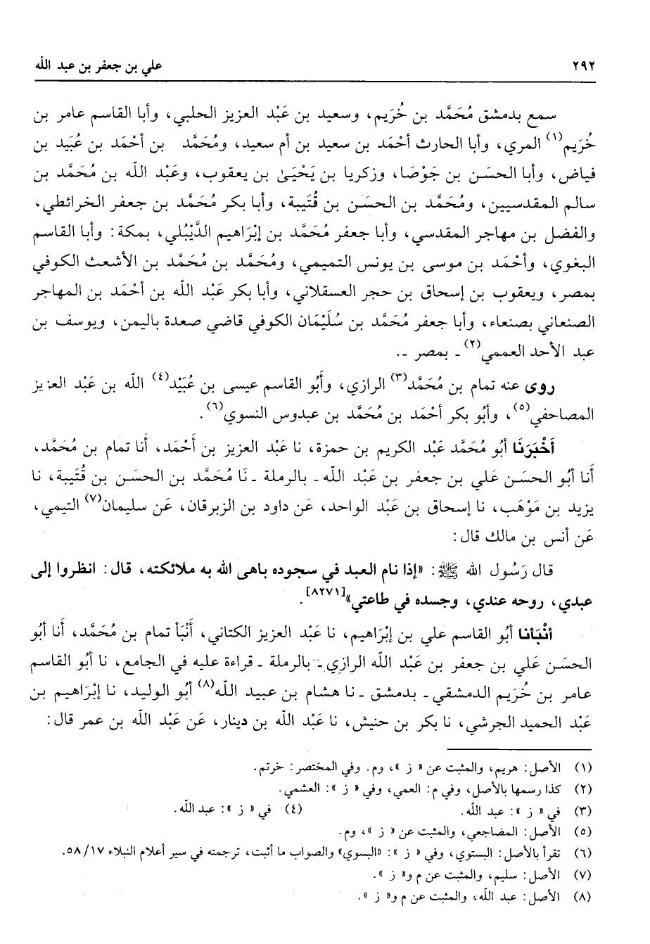 سمع بدمشق محمد بن خريم وسعيد بن عبد العزيز الحلبي وأبا القاسم عامر بن خريم (1) المري وأبا الحارث أحمد بن سعيد بن أم سعيد ومحمد بن أحمد بن عبيد بن فياض وأبا الحسن بن جوصا وزكريا بن يحيى بن يعقوب وعبد الله بن محمد بن سالم المقدسيين ومحمد بن الحسن بن قتيبة وأبا بكر محمد بن جعفر الخرائطي والفضل بن مهاجر المقدسي وأبا جعفر محمد بن إبراهيم الديبلي بمكة وأبا القاسم البغوي وأحمد بن موسى بن يونس التميمي ومحمد بن محمد بن الأشعث الكوفي بمصر ويعقوب بن إسحاق بن حجر العسقلاني وأبا بكر عبد الله بن أحمد بن المهاجر الصنعاني بصنعاء وأبا جعفر محمد بن سليمان الكوفي قاضي صعدة باليمن ويوسف بن عبد الأحد العممي (2) بمصر روى عنه تمام بن محمد (3) الرازي وأبو القاسم عيسى بن عبيد (4) الله بن عبد العزيز المصاحفي (5) وأبو بكر أحمد بن محمد بن عبدوس النسوي (6) أخبرنا أبو محمد عبد الكريم بن حمزة نا عبد العزيز بن أحمد أنا تمام بن محمد أنا أبو الحسن علي بن جعفر بن عبد الله بالرملة نا محمد بن الحسن بن قتيبة نا يزيد بن موهب نا إسحاق بن عبد الواحد عن داود بن الزبرقان عن سليمان (7) التيمي عن أنس بن مالك قال قال رسول الله (صلى الله عليه وسلم) إذا نام العبد في سجوده باهى الله به ملائكته قال انظروا إلى عبدي روحه عندي وجسده في طاعتي