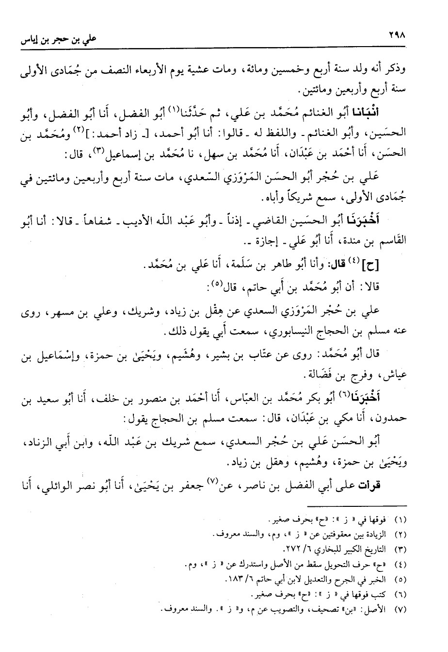 وذكر أنه ولد سنة أربع وخمسين ومائة ومات عشية يوم الأربعاء النصف من جمادى الأولى سنة أربع وأربعين ومائتين أنبأنا أبو الغنائم محمد بن علي ثم حدثنا (1) أبو الفضل أنا أبو الفضل وأبو الحسين وأبو الغنائم واللفظ له قالوا أنا أبو أحمد زاد أحمد (2) ومحمد بن الحسن أنا أحمد بن عبدان أنا محمد بن سهل نا محمد بن إسماعيل (3) قال علي بن حجر أبو الحسن المروزي السعدي مات سنة أربع وأربعين ومائتين في جمادى الأولى سمع شريكا وأباه أخبرنا أبو الحسين القاضي إذنا وأبو عبد الله الأديب شفاها قالا أنا أبو القاسم بن مندة أنا أبو علي إجازة ح (4) قال وأنا أبو طاهر بن سلمة أنا علي بن محمد قالا أن أبو محمد بن أبي حاتم قال (5) علي بن حجر المروزي السعدي عن هقل بن زياد وشريك وعلي بن مسهر روى عنه مسلم بن الحجاج النيسابوري سمعت أبي يقول ذلك قال أبو محمد روى عن عتاب بن بشير وهشيم ويحيى بن حمزة وإسماعيل بن عياش وفرج بن فضالة أخبرنا (6) أبو بكر محمد بن العباس أنا أحمد بن منصور بن خلف أنا أبو سعيد بن حمدون أنا مكي بن عبدان قال سمعت مسلم بن الحجاج يقول أبو الحسن علي بن حجر السعدي سمع شريك بن عبد الله وابن أبي الزناد ويحيى بن حمزة وهشيم وهقل بن زياد قرأت على أبي الفضل بن ناصر عن (7) جعفر بن يحيى أنا أبو نصر الوائلي انا