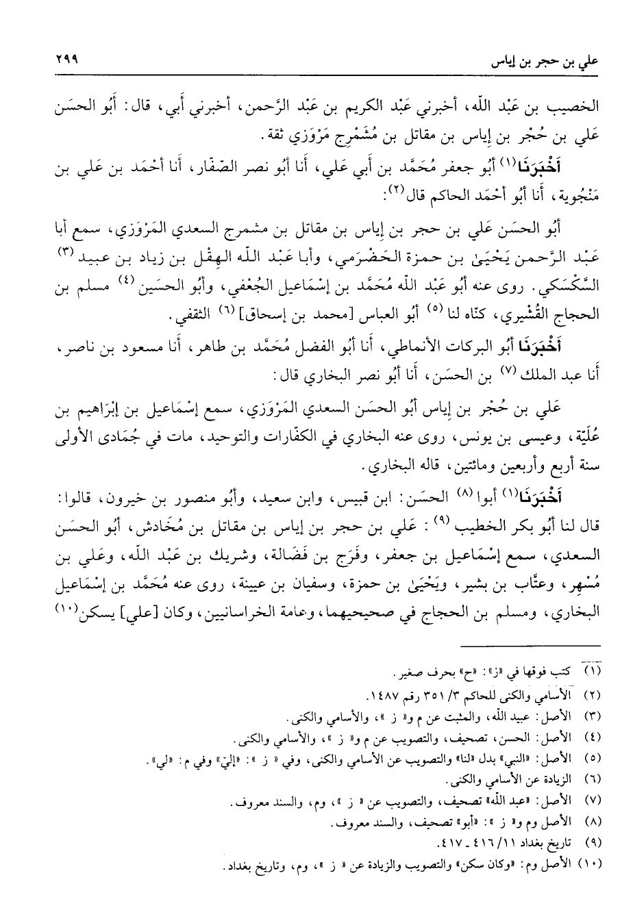 الخصيب بن عبد الله أخبرني عبد الكريم بن عبد الرحمن أخبرني أبي قال أبو الحسن علي بن حجر بن إياس بن مقاتل بن مشمرج مروزي ثقة أخبرنا (1) أبو جعفر محمد بن أبي علي أنا أبو نصر الصفار أنا أحمد بن علي بن منجوية أنا أبو أحمد الحاكم قال (2) أبو الحسن علي بن حجر بن إياس بن مقاتل بن مشمرج السعدي المروزي سمع أبا عبد الرحمن يحيى بن حمزة الحضرمي وأبا عبد الله الهقل بن زياد بن عبيد (3) السكسكي روى عنه أبو عبد الله محمد بن إسماعيل الجعفي وأبو الحسين (4) مسلم بن الحجاج القشيري كناه لنا (5) أبو العباس محمد بن إسحاق (6) الثقفي أخبرنا أبو البركات الأنماطي أنا أبو الفضل محمد بن طاهر أنا مسعود بن ناصر أنا عبد الملك (7) بن الحسن أنا أبو نصر البخاري قال علي بن حجر بن إياس أبو الحسن السعدي المروزي سمع إسماعيل بن إبراهيم بن علية وعيسى بن يونس روى عنه البخاري في الكفارات والتوحيد مات في جمادى الاولى سنة أربع وأربعين ومائتين قاله البخاري أخبرنا (1) أبوا (2) الحسن ابن قبيس وابن سعيد وأبو منصور بن خيرون قالوا قال لنا أبو بكر الخطيب (9) علي بن حجر بن إياس بن مقاتل بن مخادش أبو الحسن السعدي سمع إسماعيل بن جعفر وفرج بن فضالة وشريك بن عبد الله وعلي بن مسهر وعتاب بن بشير ويحيى بن حمزة وسفيان بن عيينة روى عنه محمد بن إسماعيل البخاري ومسلم بن الحجاج في صحيحيهما وعامة الخراسانيين وكان علي يسكن (10)