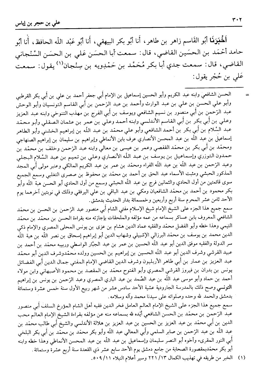 أخبرنا أبو القاسم زاهر بن طاهر أنا أبو بكر البيهقي أنا أبو عبد الله الحافظ أنا أبو حامد أحمد بن الحسين القاضي قال سمعت أبا الحسن علي بن الحسن السنجاني القاضي قال سمعت جدي أبا بكر محمد بن حمدويه بن سنجان (1) يقول سمعت علي بن حجر يقول