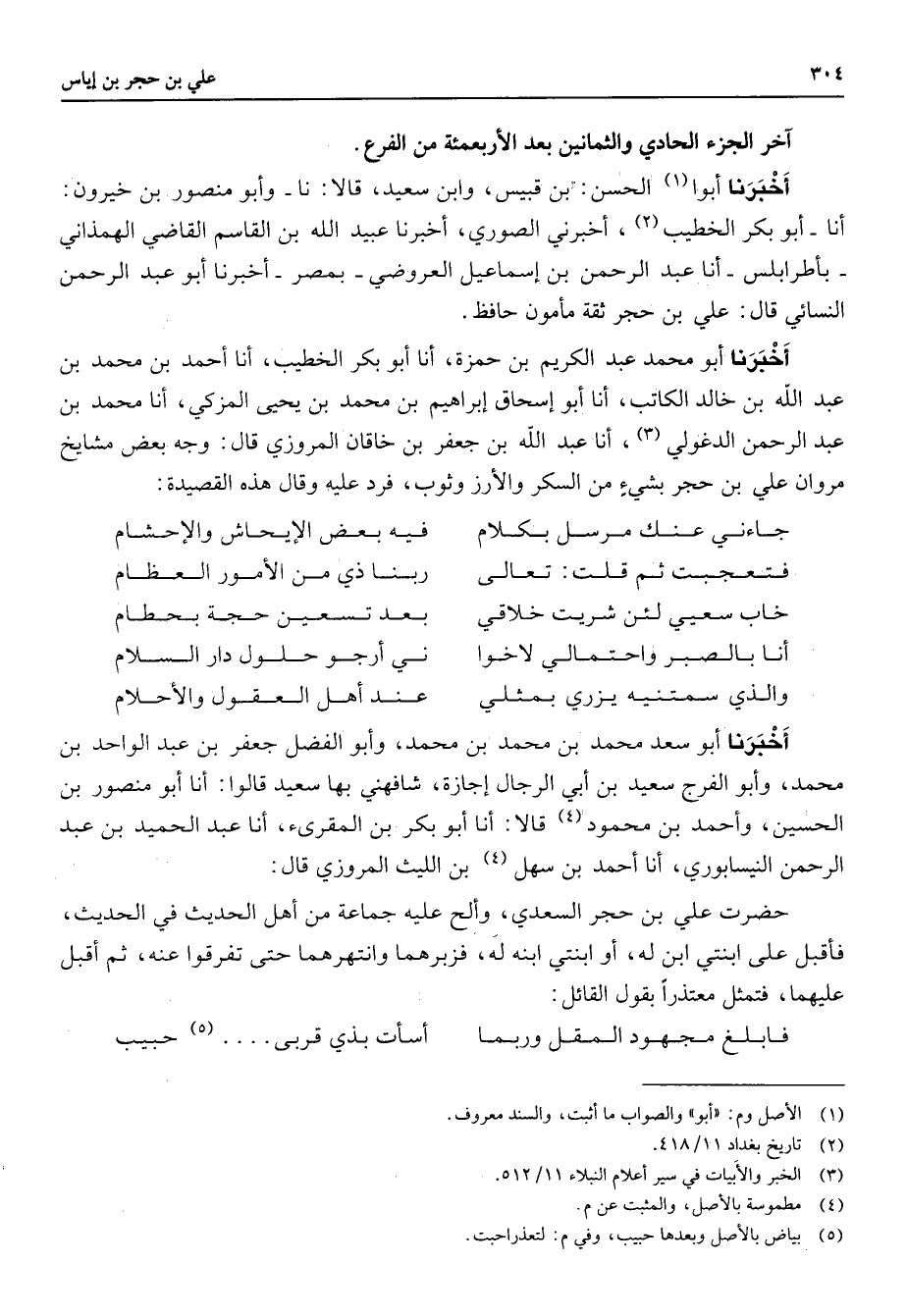 آخر الجزء الحادي والثمانين بعد الأربعمائة من الفرع أخبرنا أبوا (1) الحسن بن قبيس وابن سعيد قال نا وأبو منصور بن خيرون أنا أبو بكر الخطيب (2) أخبرني الصوري أخبرنا عبيد الله بن القاسم القاضي الهمذاني بأطرابلس أنا عبد الرحمن بن إسماعيل العروضي بمصر أخبرنا أبو عبد الرحمن النسائي قال علي بن حجر ثقة مأمون حافظ أخبرنا أبو محمد عبد الكريم بن حمزة أنا أبو بكر الخطيب أنا أحمد بن محمد بن عبد الله بن خالد الكاتب أنا أبو إسحاق إبراهيم بن محمد بن يحيى المزكي أنا محمد بن عبد الرحمن الدغولي (3) أنا عبد الله بن جعفر بن خاقان المروزي قال وجه بعض مشايخ مروان علي بن حجر بشئ من السكر والأرز وثوب فرد عليه وقال هذه القصيدة * جاءني عنك مرسل بكلام * فيه بعض الإيحاش والإحشام فتعجبت ثم قلت تعالى * ربنا ذي من الأمور العظام خاب سعيي لئن شريت خلاقي * بعد تسعين حجة بحطام أنا بالصبر واحتمالي لاخوا * ني أرجو حلول دار السلام والذي سمتنيه يزري بمثلي * عند أهل العقول والأحلام * أخبرنا أبو سعد محمد بن محمد بن محمد وأبو الفضل جعفر بن عبد الواحد بن محمد وأبو الفرج سعيد بن أبي الرجال إجازة شافهني بها سعيد قالوا أنا أبو منصور بن الحسين وأحمد بن محمود (4) قالا أنا أبو بكر بن المقرئ أنا عبد الحميد بن عبد الرحمن النيسابوري أنا أحمد بن سهل بن الليث المروزي قال حضرت علي بن حجر السعدي وألح عليه جماعة من أهل الحديث في الحديث فأقبل على ابنتي وابن له أو ابنتي ابنه له فزبرهما وانتهرهما حتى تفرقوا عنه ثم أقبل عليهما فتمثل معتذرا بقول القائل * فأبلغ مجهود المقل وربما * أسأت بذي قربى (5) حبيب *