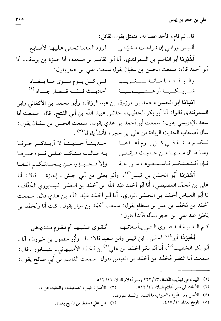 قال ثم قام فأخذ عصا له فتمثل بقول القائل * ألبس ورائي إن تراخت مغيتي * لزوم العصا تحنى عليها الأصابع * أخبرنا أبو القاسم بن السمرقندي أنا أبو القاسم بن مسعدة أنا حمزة بن يوسف أنا أبو أحمد قال سمعت الحسن بن سفيان يقول سمعت علي بن حجر يقول * وظيفتنا مائة للغريب * في كل يوم سوى ما يفاد شريكية أو هشيمية * أحاديث فقه قصار جياد (1) * أنبأنا أبو الحسن محمد بن مرزوق بن عبد الرزاق وأبو محمد بن الأكفاني وابن السمرقندي قالوا أنا أبو بكر الخطيب حدثني عبيد الله بن أبي الفتح قال سمعت أبا سعد الإدريسي يقول سمعت أبو أحمد بن عدي يقول سمعت الحسن بن سفيان يقول سأل أصحاب الحديث الزيادة من علي بن حجر فأنشأ يقول (2) * لكم مئة في كل يوم أعدها * حديثا حديثا لا أزيدكم حرفا وما طال منها من حديث فإنني * به طالب منكم على قدره صرفا فإن أقنعتكم فاسمعوها سريحة * وإلا فجيؤوا من يحدثكم ألفا * أخبرنا أبو الحسن بن قبيس (3) وأبو يعلى بن أبي جيش إجازة قالا أنا علي بن محمد المصيصي أنا أبو أحمد عبد الله بن أحمد بن الحسن النيسابوري الخفاف نا أبو العباس أحمد بن الحسن الرازي أنا أبو أحمد عبد الله بن عدي قال سمعت أحمد بن محمد بن عمر بن بسطام يقول سمعت أحمد بن سيار يقول كنت أنا ومحمد بن يحيى عند علي بن حجر يسأله فأنشأ يقول * كم الغاية القصوى التي يأملانها * أتقوى عليها أم تقوم فتنهض * أخبرنا أبوا (4) الحسن ابن قبيس وابن سعيد قالا نا وأبو منصور بن خيرون أنا أبو بكر الخطيب 5 0) أنا أبو بكر أحمد بن علي (6) بن محمد الأصبهاني بنيسابور قال سمعت أبا النضر محمد بن أحمد بن العباس يقول سمعت القاسم بن أبي صالح يقول
