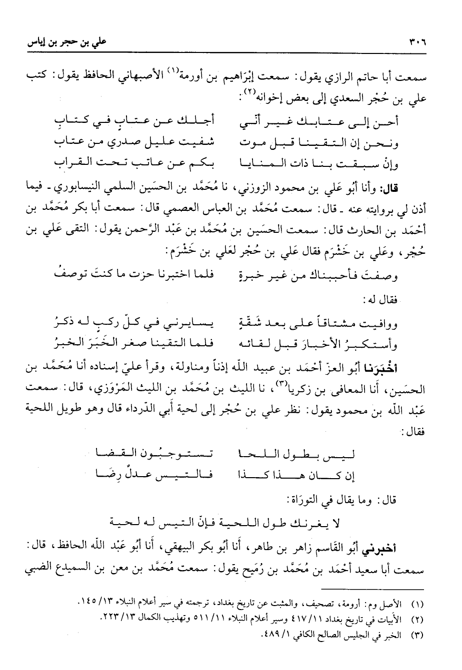 سمعت أبا حاتم الرازي يقول سمعت إبراهيم بن أورمة (1) الأصبهاني الحافظ يقول كتب علي بن حجر السعدي إلى بعض إخوانه (2) * أحن إلى عتابك غير أني * أجلك عن عتاب في كتاب ونحن إن التقينا قبل موت * شفيت عليل صدري من عتاب وإن سبقت بنا ذات المنايا * بكم عن عاتب تحت القراب * قال وأنا أبو علي بن محمود الزوزني نا محمد بن الحسين السلمي النيسابوري فيما أذن لي بروايته عنه قال سمعت محمد بن العباس العصمي قال سمعت أبا بكر محمد بن أحمد بن الحارث قال سمعت الحسين بن محمد بن عبد الرحمن يقول التقى علي بن حجر وعلي بن خشرم فقال علي بن حجر لعلي بن خشرم * وصفت فأحببناك من غير خبرة * فلما اختبرنا حزت ما كنت توصف * فقال له * ووافيت مشتاقا على بعد شقة * يسايرني في كل ركب له ذكر وأستكبر الأخبار قبل لقائه * فلما التقينا صغر الخبر الخبر * أخبرنا أبو العز أحمد بن عبيد الله إذنا ومناولة وقرأ علي إسناده أنا محمد بن الحسين أنا المعافى بن زكريا (3) نا الليث بن محمد بن الليث المروزي قال سمعت عبد الله بن محمود يقول نظر علي بن حجر إلى لحية أبي الدرداء قال وهو طويل اللحية فقال * ليس بطول اللحا * تستوجبون القضا إن كان هذا كذا * فالتيس عدل رضا * قال وما يقال في التوراة * لا يغرنك طول اللحية فإن التيس له لحية أخبرني أبو القاسم زاهر بن طاهر أنا أبو بكر البيهقي أنا أبو عبد الله الحافظ قال سمعت أبا سعيد أحمد بن محمد بن رميح يقول سمعت محمد بن معن بن السميدع الضبي