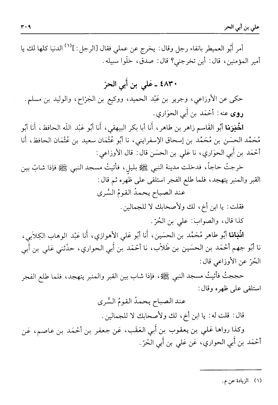 4830 - علي بن أبي الحر حكى عن الأوزاعي وجرير بن عبد الحميد ووكيع بن الجراح والوليد بن مسلم روى عنه أحمد بن أبي الحواري أخبرنا أبو القاسم زاهر بن طاهر أنا أبا بكر البيهقي أنا أبو عبد الله الحافظ أنا أبو محمد الحسن بن محمد بن إسحاق الإسفرايني نا أبو عثمان سعيد بن عثمان الحافظ أنا أحمد بن أبي الحواري نا علي بن الحسن قال قال الأوزاعي خرجت حاجا فدخلت مدينة النبي (صلى الله عليه وسلم) بليل فأتيت مسجد النبي (صلى الله عليه وسلم) فإذا شاب بين القبر والمنبر يتهجد فلما طلع الفجر استلقى على ظهره ثم قال * عند الصباح يحمد القوم السرى فقلت يا ابن أخ لك ولأصحابك لا للجمالين كذا قال والصواب علي بن الحر أنبأنا أبو طاهر محمد بن الحسين أنا أبو علي الأهوازي أنا عبد الوهاب الكلابي نا أبو جهم أحمد بن الحسين بن طلاب أنا أحمد بن أبي الحواري حدثني علي بن أبي الحر عن الأوزاعي قال حججت فأتيت مسجد النبي (صلى الله عليه وسلم) فإذا شاب بين القبر والمنبر يتهجد فلما طلع الفجر استلقى على ظهره وقال * عند الصباح يحمد القوم السرى قال قلت له يا ابن أخ لك ولأصحابك لا للجمالين وكذا رواها علي بن يعقوب بن أبي العقب عن جعفر بن أحمد بن عاصم عن أحمد بن أبي الحواري عن علي بن أبي الحر