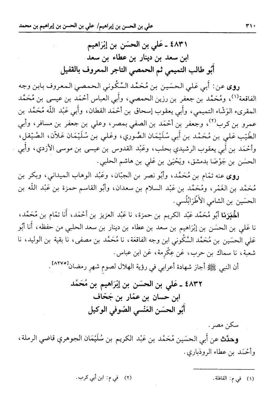 4831 - علي بن الحسن بن إبراهيم بن سعد بن دينار بن عطاء بن سعد أبو طالب التميمي ثم الحمصي التاجر المعروف بالقفيل روى عن أبي علي الحسين بن محمد السكوني الحمصي المعروف بابن وجه الفاقعة (1) ومحمد بن جعفر بن رزين الحمصي وأبي العباس أحمد بن عيسى بن محمد المقرئ الوشاء التميمي وأبي يعقوب إسحاق بن أحمد القطان وأبي عبد الله محمد بن عمرو بن كرب (2) وجعفر بن أحمد بن الصفي بمصر وعلي بن جعفر بن مسافر وأبي الطيب علي بن محمد بن أبي سليمان الصوري وعلي بن سليمان علان الصيقل وأحمد بن أبي يعقوب الرشيدي بحلب وعبد القدوس بن عيسى بن موسى الأزدي وأبي الحسن بن جوصا بدمشق ويحيى بن علي بن هاشم الحلبي روى عنه تمام بن محمد وأبو نصر بن الجبان وعبد الوهاب الميداني وبكر بن محمد بن الغمر ومحمد بن عبد السلام بن سعدان وأبو القاسم حمزة بن عبد الله بن الحسين بن الشامي الأطرابلسي أخبرنا أبو محمد عبد الكريم بن حمزة نا عبد العزيز بن أحمد أنا تمام بن محمد نا علي بن الحسن بن إبراهيم بن سعد بن عطاء بن دينار بن سعد الحلبي من حفظه أنا أبو علي الحسين بن محمد السكوني ابن وجه الفاقعة نا محمد بن مصفى نا بقية بن الوليد نا شعبة نا سماك بن حرب عن عكرمة عن ابن عباس أن النبي (صلى الله عليه وسلم) أجاز شهادة أعرابي في رؤية الهلال لصوم شهر رمضان