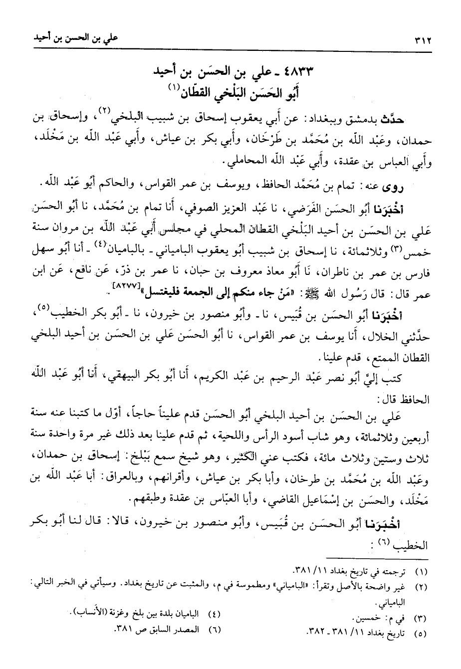 4833 - علي بن الحسن بن أحيد أبو الحسن البلخي القطان (1) حدث بدمشق وببغداد عن أبي يعقوب إسحاق بن شبيب البلخي (2) وإسحاق بن حمدان وعبد الله بن محمد بن طرخان وأبي بكر بن عياش وأبي عبد الله بن مخلد وأبي العباس بن عقدة وأبي عبد الله المحاملي روى عنه تمام بن محمد الحافظ ويوسف بن عمر القواس والحاكم أبو عبد الله أخبرنا أبو الحسن الفرضي نا عبد العزيز الصوفي أنا تمام بن محمد نا أبو الحسن علي بن الحسن بن أحيد البلخي القطان المحلي في مجلس أبي عبد الله بن مروان سنة خمس (3) وثلاثمائة نا إسحاق بن شبيب أبو يعقوب البامياني بالباميان (4) أنا أبو سهل فارس بن عمر بن ناطران نا أبو معاذ معروف بن حبان نا عمر بن ذر عن نافع عن ابن عمر قال قال رسول الله (صلى الله عليه وسلم) من جاء منكم إلى الجمعة فليغتسل