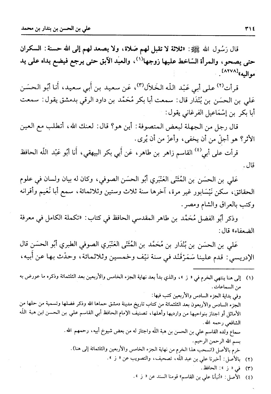 [8278] قرأت (1) على أبي عبد الله الخلال (3) عن سعيد بن أبي سعيد أنا أبو الحسن علي بن الحسن بن بندار قال سمعت أبا بكر محمد بن داود الرقي بدمشق يقول سمعت أبا بكر بن إسماعيل الفرغاني يقول قال رجل من الجهلة لبعض المتصوفة أين هو قال لعنك الله أتطلب مع العين الأثر هو أجل من أن يخفى وأعز من أن يرى قرأت علي أبي (4) القاسم زاهر بن طاهر عن أبي بكر البيهقي أنا أبو عبد الله الحافظ قال علي بن الحسن بن المثنى العنبري أبو الحسن الصوفي وكان له بيان ولسان في علوم الحقائق سكن نيسابور غير مرة آخرها سنة ثلاث وستين وثلاثمائة سمع أبا نعيم وأقرانه وكتب بالعراق والشام ومصر وذكر أبو الفضل محمد بن طاهر المقدسي الحافظ في كتاب تكملة الكامل في معرفة الضعفاء قال علي بن الحسن بن بندار بن محمد بن المثنى العنبري الصوفي الطبري أبو الحسن قال الإدريسي قدم علينا سمرقند في سنة نيف وخمسين وثلاثمائة وحدث بها عن أبيه