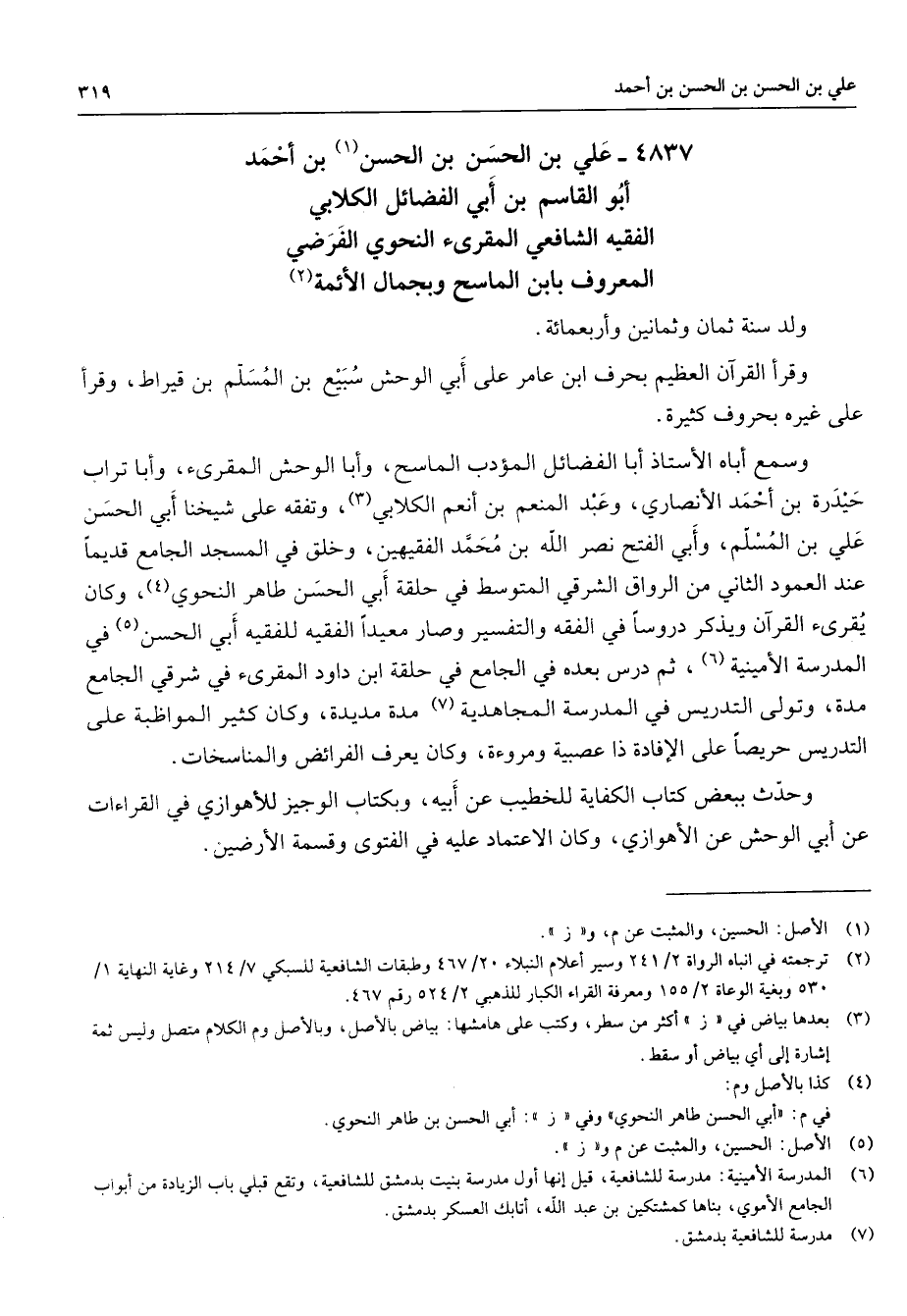 4837 - علي بن الحسن بن الحسن (1) بن أحمد أبو القاسم بن أبي الفضائل الكلابي الفقيه الشافعي المقرئ النحوي الفرضي المعروف بابن الماسح وبجمال الأئمة (2) ولد سنة ثمان وثمانين وأربعمائة وقرأ القرآن العظيم بحرف ابن عامر على أبي الوحش سبيع بن المسلم بن قيراط وقرأ على غيره بحروف كثيرة وسمع أباه الأستاذ أبا الفضائل المؤدب الماسح وأبا الوحش المقرئ وأبا تراب حيدرة بن أحمد الأنصاري وعبد المنعم بن أنعم الكلابي (3) وتفقه على شيخنا أبي الحسن علي بن المسلم وأبي الفتح نصر الله بن محمد الفقيهين وخلق في المسجد الجامع قديما عند العمود الثاني من الرواق الشرقي المتوسط في حلقة أبي الحسن طاهر النحوي (4) وكان يقرئ القرآن ويذكر دروسا في الفقه والتفسير وصار معيدا الفقيه للفقيه أبي الحسن (5) في المدرسة الأمينية (6) ثم درس بعده في الجامع في حلقة ابن داود المقرئ في شرقي الجامع مدة وتولى التدريس في المدرسة المجاهدية (7) مدة مديدة وكان كثير المواظبة على التدريس حريصا على الإفادة ذا عصبية ومروءة وكان يعرف الفرائض والمناسخات وحدث ببعض كتاب الكفاية للخطيب عن أبيه وبكتاب الوجيز للأهوازي في القراءات عن أبي الوحش عن الأهوازي وكان الإعتماد عليه في الفتوى وقسمة الأرضين