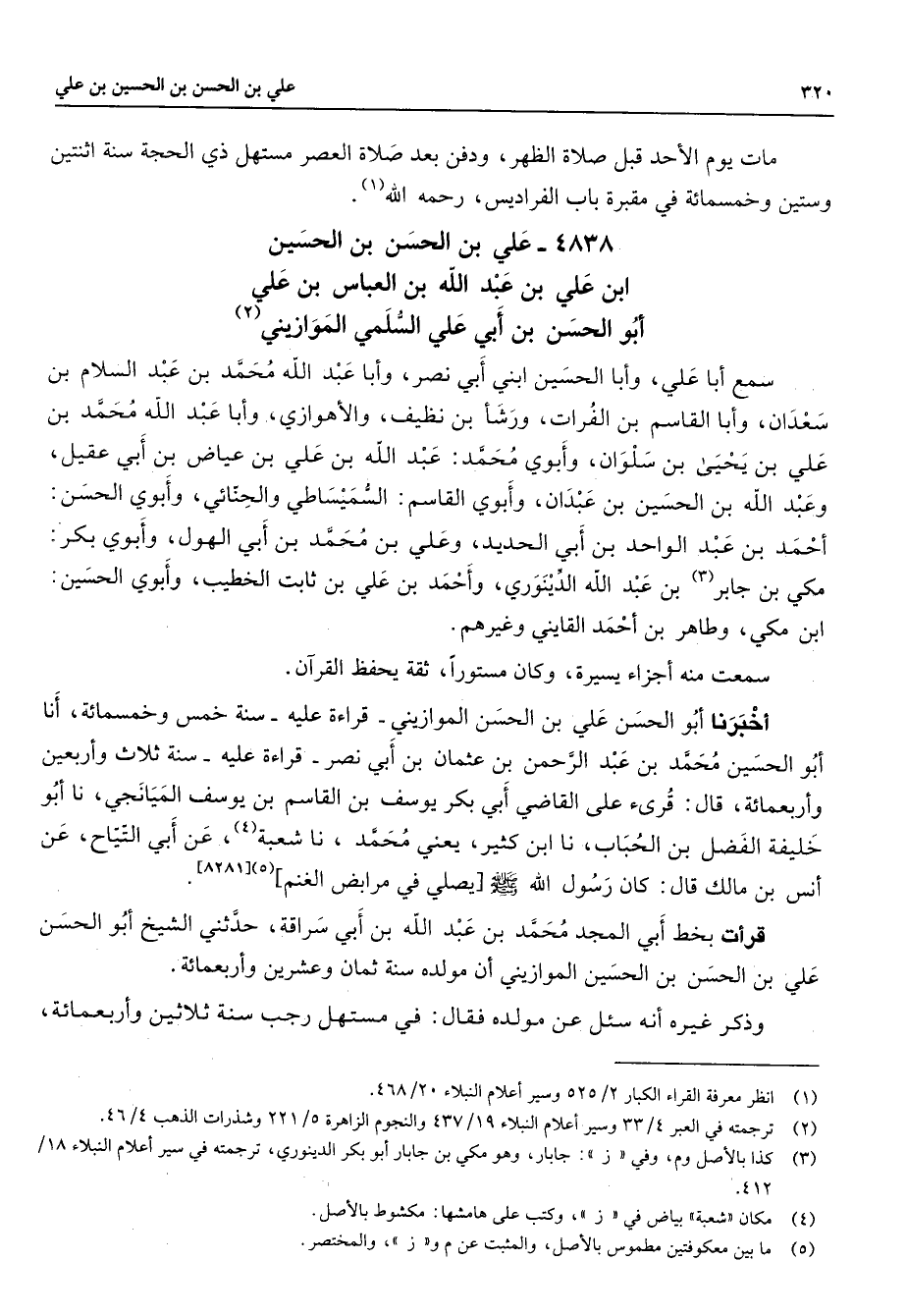 4838 - علي بن الحسن بن الحسين بن علي بن عبد الله بن العباس بن علي أبو الحسن بن أبي علي السلمي الموازيني (2) سمع أبا علي وأبا الحسين ابني أبي نصر وأبا عبد الله محمد بن عبد السلام بن سعدان وأبا القاسم بن الفرات ورشأ بن نظيف والأهوازي وأبا عبد الله محمد بن علي بن يحيى بن سلوان وأبوي محمد عبد الله بن علي بن عياض بن أبي عقيل وعبد الله بن الحسين بن عبدان وأبوي القاسم السميساطي والحنائي وأبوي الحسن أحمد بن عبد الواحد بن أبي الحديد وعلي بن محمد بن أبي الهول وأبوي بكر مكي بن جابر (3) بن عبد الله الدينوري وأحمد بن علي بن ثابت الخطيب وأبوي الحسين بن مكي وطاهر بن أحمد القايني وغيرهم سمعت منه أجزاء يسيرة وكان مستورا ثقة يحفظ القرآن أخبرنا أبو الحسن علي بن الحسن الموازيني قراءة عليه سنة خمس وخمسمائة أنا أبو الحسين محمد بن عبد الرحمن بن عثمان بن أبي نصر قراءة عليه سنة ثلاث وأربعين وأربعمائة قال قرئ على القاضي أبي بكر يوسف بن القاسم بن يوسف الميانجي نا أبو خليفة الفضل بن الحباب نا ابن كثير يعني محمد نا شعبة (4) عن أبي التياح عن أنس بن مالك قال كان رسول الله (صلى الله عليه وسلم) يصلي في مرابض الغنم (5)