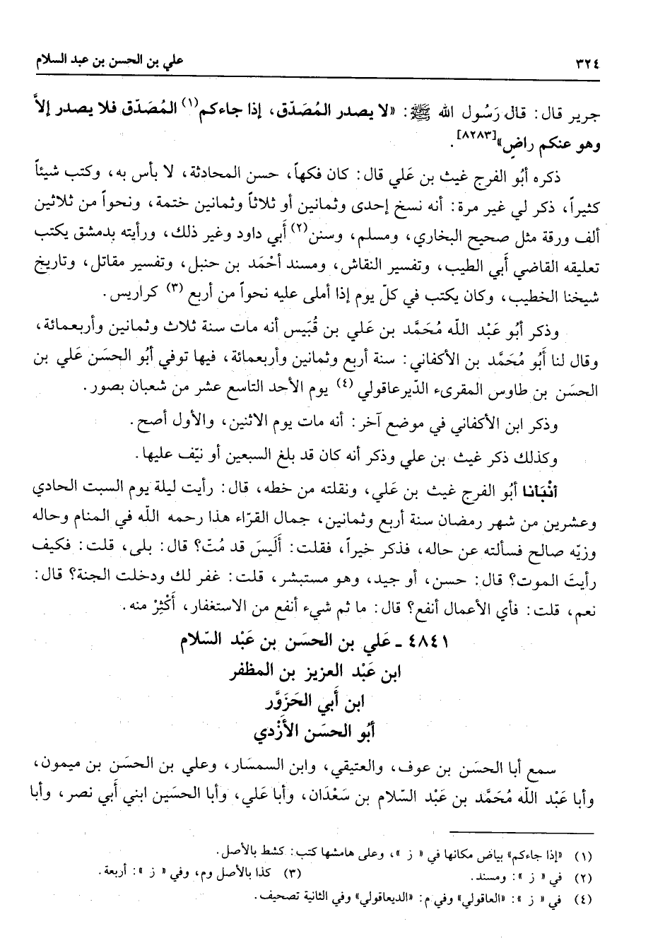 4841 - علي بن الحسن بن عبد السلام بن عبد العزيز بن المظفر بن ابي الحزور أبو الحسن الأزدي سمع أبا الحسن بن عوف والعتيقي وابن السمسار وعلي بن الحسن بن ميمون وأبا عبد الله محمد بن عبد السلام بن سعدان وأبا علي وأبا الحسين ابني أبي نصر وأبا
