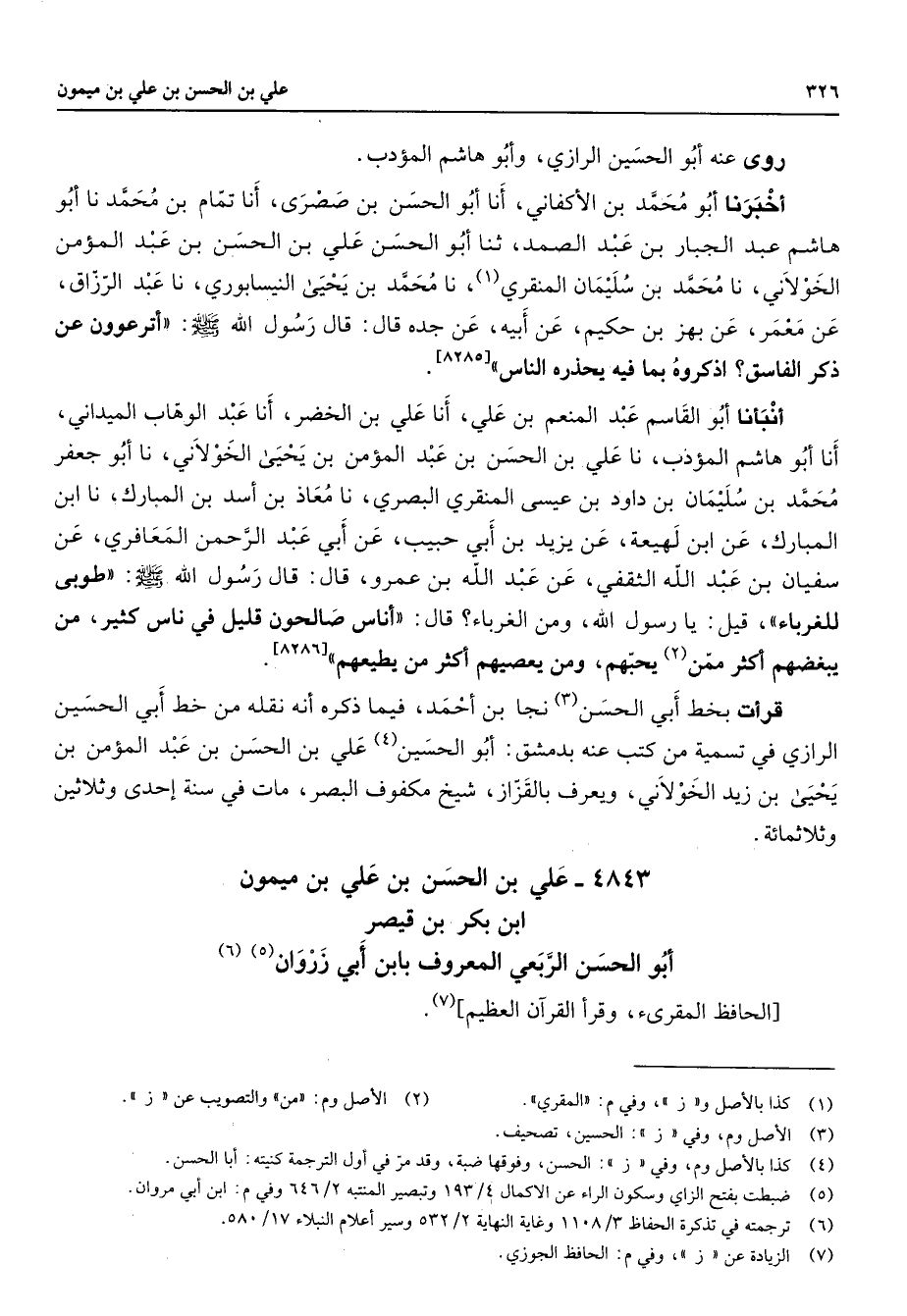 4843 - علي بن الحسن بن علي بن ميمون بن بكر بن قيصر أبو الحسن الربعي المعروف بابن أبي زروان (5) (6) الحافظ المقرئ وقرأ القرآن العظيم (7)