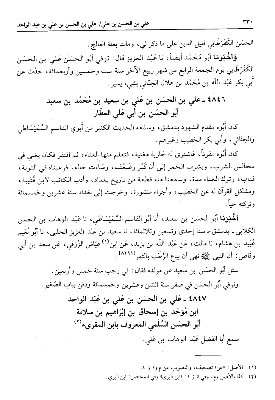 4846 - علي بن الحسن بن علي بن سعيد بن محمد بن سعيد أبو الحسن بن أبي علي العطار كان أبوه مقدم الشهود بدمشق وسمعه الحديث الكثير من أبوي القاسم السميساطي والحنائي وأبي بكر الخطيب وغيرهم كان أبوه مقرئا فاشترى له جارية مغنية فتعلم منها الغناء ثم افتقر فكان يغني في مجالس الشرب ويشرب الخمر إلى أن كبر وضعف وساءت حاله فرغبناه في التوبة فتاب وترك الغناء مدة وسمعنا منه قطعة من تاريخ بغداد وأدب الكاتب لأبن قتيبة ومشكل القرآن له عن الخطيب وأجزاء منشورة وخرجت إلى بغداد سنة عشرين وخمسمائة وتركته حيا أخبرنا أبو الحسن بن سعيد أنا أبو القاسم السميساطي أنا عبد الوهاب بن الحسن الكلابي بدمشق سنة إحدى وتسعين وثلاثمائة أنا سعيد بن عبد العزيز الحلبي أنا أبو نعمي عبيد بن هشام أنا مالك عن عبد الله بن يزيد عن ابن (1) عياش الزرقي عن سعد بن أبي وقاص أن النبي (صلى الله عليه وسلم) نهى أن يباع الرطب بالتمر