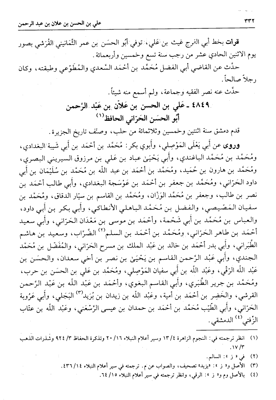 4849 - علي بن الحسن بن علان بن عبد الرحمن أبو الحسن الحراني الحافظ (1) قدم دمشق سنة اثنتين وخمسين وثلاثمائة من حلب وصنف تاريخ الجزيرة وروى عن أبي يعلى الموصلي وأبوي بكر محمد بن أحمد بن أبي شيبة البغدادي ومحمد بن محمد الباغندي وأبي يحيى عباد بن علي بن مرزوق السيريني البصري ومحمد بن هارون بن حميد ومحمد بن أحمد بن عبد الله بن محمد بن سليمان بن أبي داود الحراني ومحمد بن جعفر بن أحمد بن عوسجة البغدادي وأبي طالب أحمد بن نصر بن طالب وجعفر بن محمد الوزان ومحمد بن القاسم بن سيار الدقاق ومحمد بن سفيان المصيصي والفضل بن محمد الباهلي الأنطاكي وأبي بكر بن أبي داود والعباس بن محمد بن أبي شحمة وأحمد بن موسى بن معدان الحراني وأبي سعيد أحمد بن طاهر الحراني ومحمد بن أحمد بن السلم (2) الضراب وسعيد بن هاشم الطبراني وأبي بدر أحمد بن خالد بن عبد الملك بن مسرح الحراني والمفضل بن محمد الجندي وأبي عبد الرحمن القاسم بن يحيى بن نصر بن أخي سعدان والحسن بن عبد الله الرقي وعبد الله بن أبي سفيان الموصلي ومحمد بن علي بن الحسن بن حرب ومحمد بن جرير الطبري وأبي القاسم البغوي وأحمد بن عبد الله بن عبد الرحمن القرشي والخضر بن أحمد بن أمية وعبد الله بن زيدان بن بريد (3) البجلي وأبي عروبة الحراني وأبي الطيب محمد بن أحمد بن حمدان بن عيسى الرسعني وعبد الله بن عتاب الزفتي (4) الدمشقي