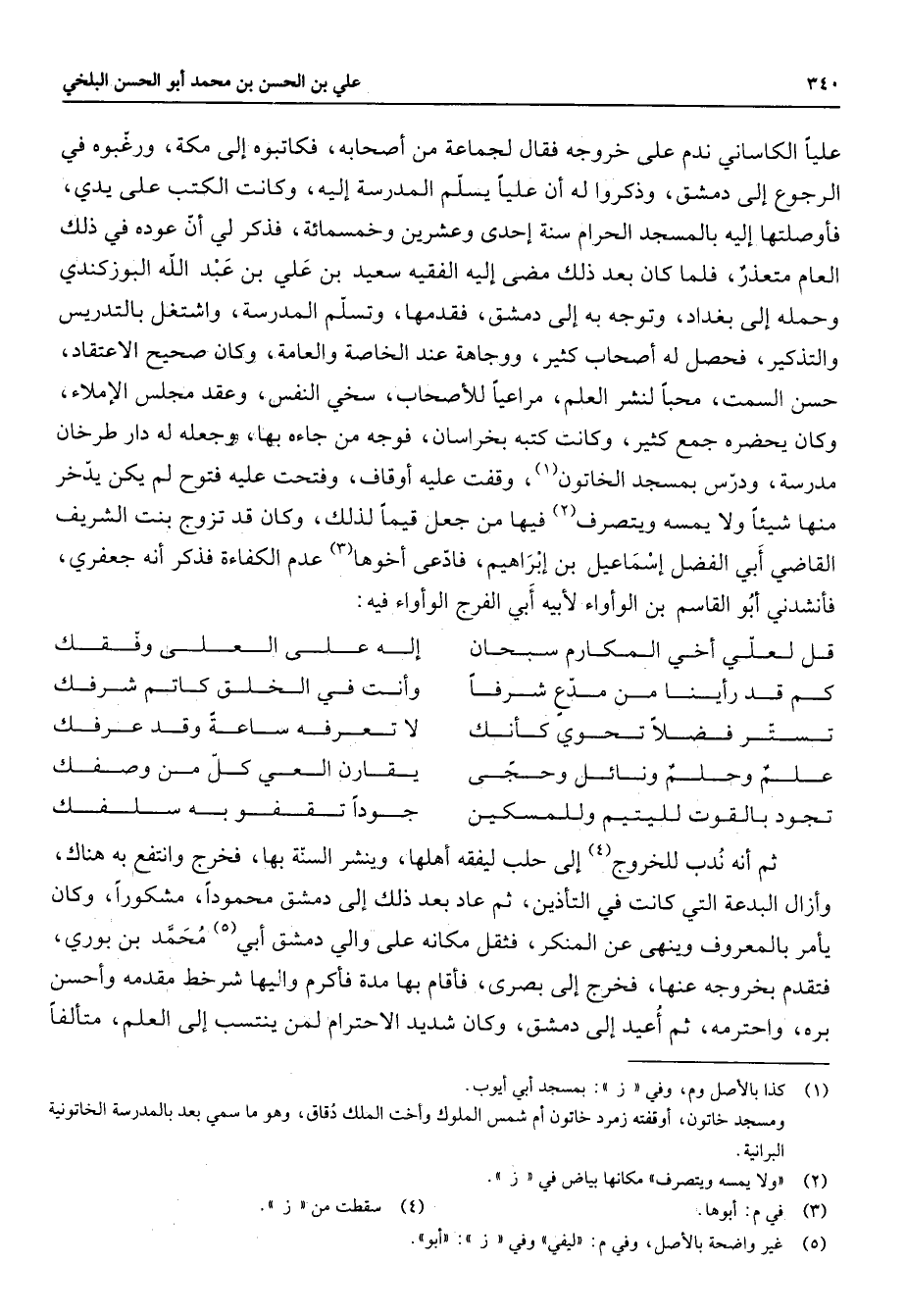 عليا الكاساني ندم على خروجه فقال لجماعة من أصحابه فكاتبوه إلى مكة ورغبوه في الرجوع إلى دمشق وذكروا له أن عليا يسلم المدرسة إليه وكانت الكتب على يدي فأوصلتها إليه بالمسجد الحرام سنة إحدى وعشرين وخمسمائة فذكر لي أن عوده في ذلك العام متعذر فلما كان بعد ذلك مضى إليه الفقيه سعيد بن علي بن عبد الله البوزكندي وحمله إلى بغداد وتوجه به إلى دمشق فقدمها وتسلم المدرسة واشتغل بالتدريس والتذكير فحصل له أصحاب كثير ووجاهة عند الخاصة والعامة وكان صحيح الاعتقاد حسن السمت محبا لنشر العلم مراعيا للأصحاب سخي النفس وعقد مجلس الإملاء وكان يحضره جمع كثير وكانت كتبه بخراسان فوجه من جاءه بها وجعله له دار طرخان مدرسة ودرس بمسجد الخاتون (1) وقفت عليه أوقاف وفتحت عليه فتوح لم يكن يدخر منها شيئا ولا يمسه ويتصرف (2) فيها من جعل قيما لذلك وكان قد تزوج بنت الشريف القاضي أبي الفضل إسماعيل بن إبراهيم فادعى أخوها (3) عدم الكفاءة فذكر أنه جعفري فأنشدني أبو القاسم بن الوأواء لأبيه أبي الفرج الوأواء فيه * قل لعلي أخي المكارم سبحان * إله على العلى وفقك * كم قد رأينا من مدع شرفا * وأنت في الخلق كاتم شرفك تستر فضلا تحوي كأنك * لا تعرفه ساعة وقد عرفك علم وحلم ونائل وحجى * يقارن العي كل من وصفك تجود بالقوت لليتيم وللمسكين * جودا تقفو به سلفك * ثم أنه ندب للخروج (4) إلى حلب ليفقه أهلها وينشر السنة بها فخرج وانتفع به هناك وأزال البدعة التي كانت في التأذن ثم عاد بعد ذلك إلى دمشق محمودا مشكورا وكان يأمر بالمعروف وينهى عن المنكر فثقل مكانه على والي دمشق أبي (5) محمد بن بوري فتقدم بخروجه عنها فخرج إلى بصرى فأقام بها مدة فأكرم وإليها شرخط مقدمه وأحسن بره واحترمه ثم أعيد إلى دمشق وكان شديد الاحترام لمن ينتسب إلى العلم متألفا
