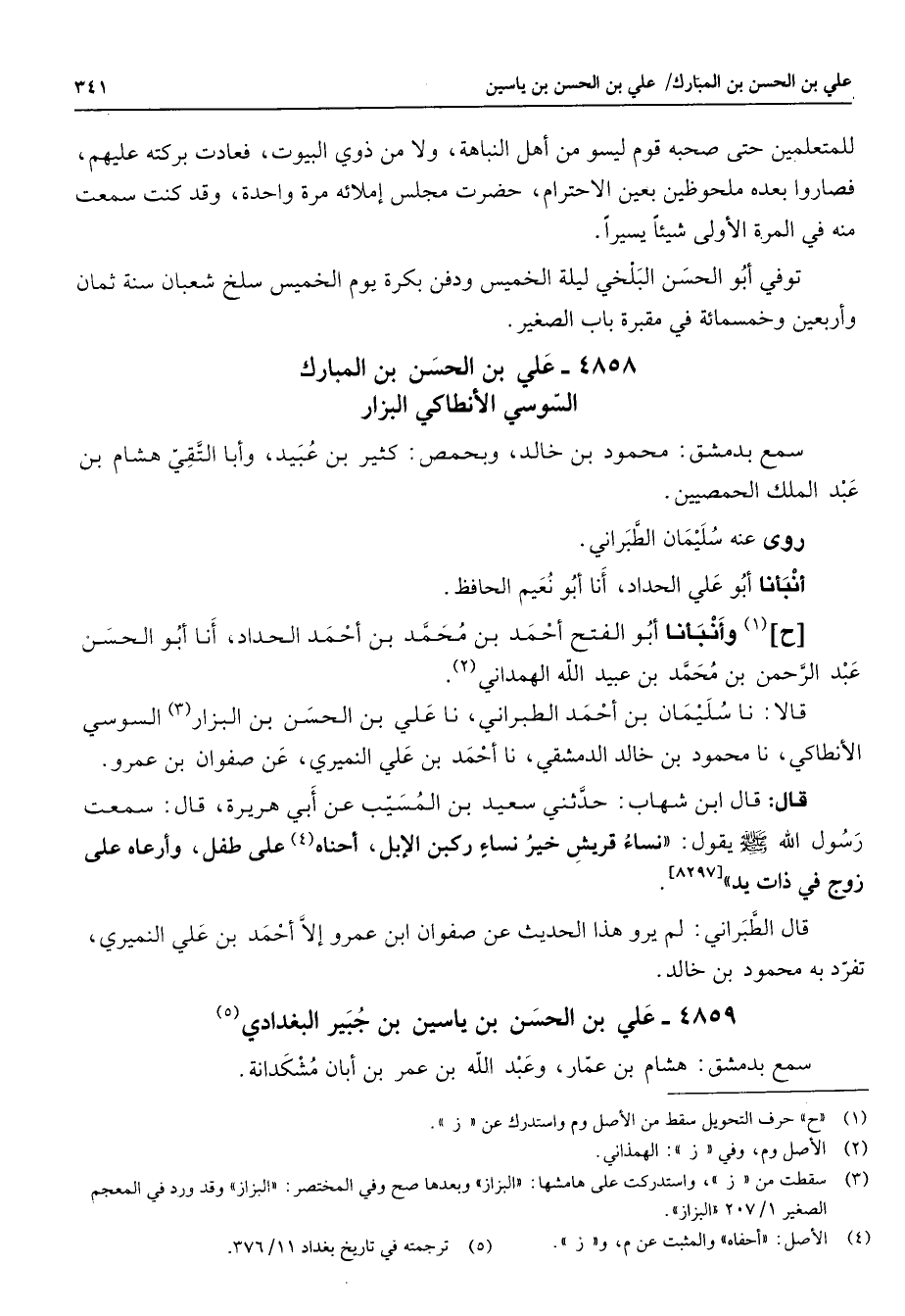 4858 - علي بن الحسن بن المبارك السوسي الأنطاكي البزار سمع بدمشق محمود بن خالد وبحمص كثير بن عبيد وأبا التقي هشام بن عبد الملك الحمصيين روى عنه سليمان الطبراني أنبأنا أبو علي الحداد أنا أبو نعيم الحافظ ح (1) وأنبأنا أبو الفتح أحمد بن محمد بن أحمد الحداد أنا أبو الحسن عبد الرحمن بن محمد بن عبيد الله الهمداني (2) قالا نا سليمان بن أحمد الطبراني نا علي بن الحسن بن البزار (3) السوسي الأنطاكي نا محمود بن خالد الدمشقي نا أحمد بن علي النميري عن صفوان بن عمرو قال قال ابن شهاب حدثني سعيد بن المسيب عن ابي هريرة قال سمعت رسول الله (صلى الله عليه وسلم) يقول نساء قريش خير نساء ركبن الإبل أحناه (4) على طفل وأرعاه على زوج في ذات يد قال الطبراني لم يرو هذا الحديث عن صفوان ابن عمرو إلا أحمد بن علي النميري تفرد به محمود بن خالد