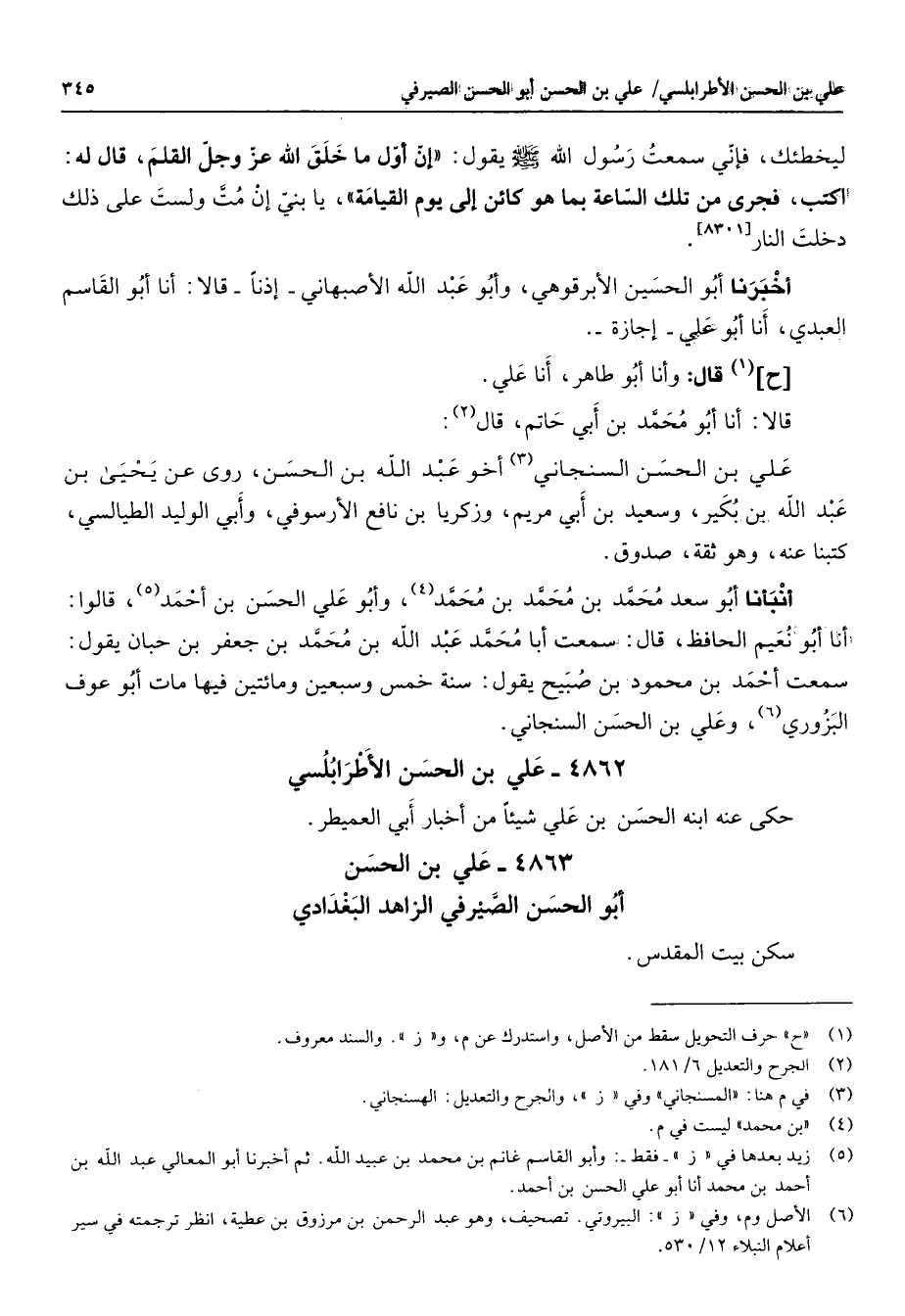 ليخطئك فإني سمعت رسول الله (صلى الله عليه وسلم) يقول إن أول ما خلق الله عز وجل القلم قال له اكتب فجرى من تلك الساعة بما هو كائن إلى يوم القيامة يا بني إن مت ولست على ذلك دخلت النار أخبرنا أبو الحسين الأبرقوهي وأبو عبد الله الأصبهاني إذنا قالا أنا أبو القاسم العبدي أنا أبو علي إجازة ح (1) قال وأنا أبو طاهر أنا علي قالا أنا أبو محمد بن أبي حاتم قال (2) علي بن الحسن السنجاني (3) أخو عبد الله بن الحسن روى عن يحيى بن عبد الله بن بكير وسعيد بن أبي مريم وزكريا بن نافع الأرسوفي وأبي الوليد الطيالسي كتبنا عنه وهو ثقة صدوق أنبأنا أبو سعد محمد بن محمد بن محمد (4) وأبو علي الحسن بن أحمد (5) قالوا أنا أبو نعيم الحافظ قال سمعت أبا محمد عبد الله بن محمد بن جعفر بن حبان يقول سمعت أحمد بن محمود بن صبيح يقول سنة خمس وسبعين ومائتين فيها مات أبو عوف البزوري (6) وعلي بن الحسن السنجاني