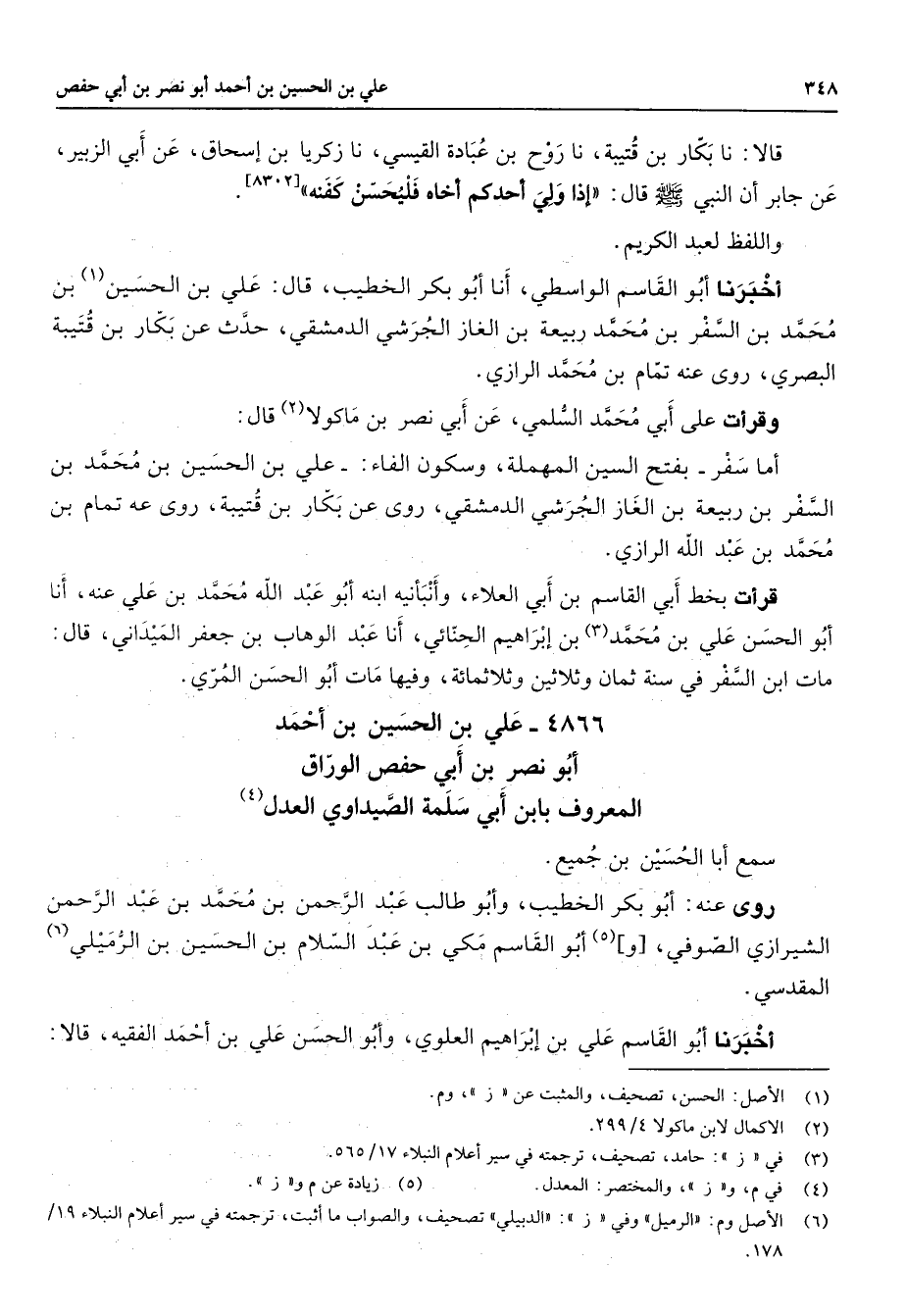 4866 - علي بن الحسين بن أحمد أبو نصر بن أبي حفص الوراق المعروف بابن أبي سلمة الصيداوي العدل (4) سمع أبا الحسين بن جميع روى عنه أبو بكر الخطيب وأبو طالب عبد الرحمن بن محمد بن عبد الرحمن الشيرازي الصوفي وأبو القاسم (5) مكي بن عبد السلام بن الحسين بن الرميلي (6) المقدسي أخبرنا أبو القاسم علي بن إبراهيم العلوي وأبو الحسن علي بن أحمد الفقيه قالا