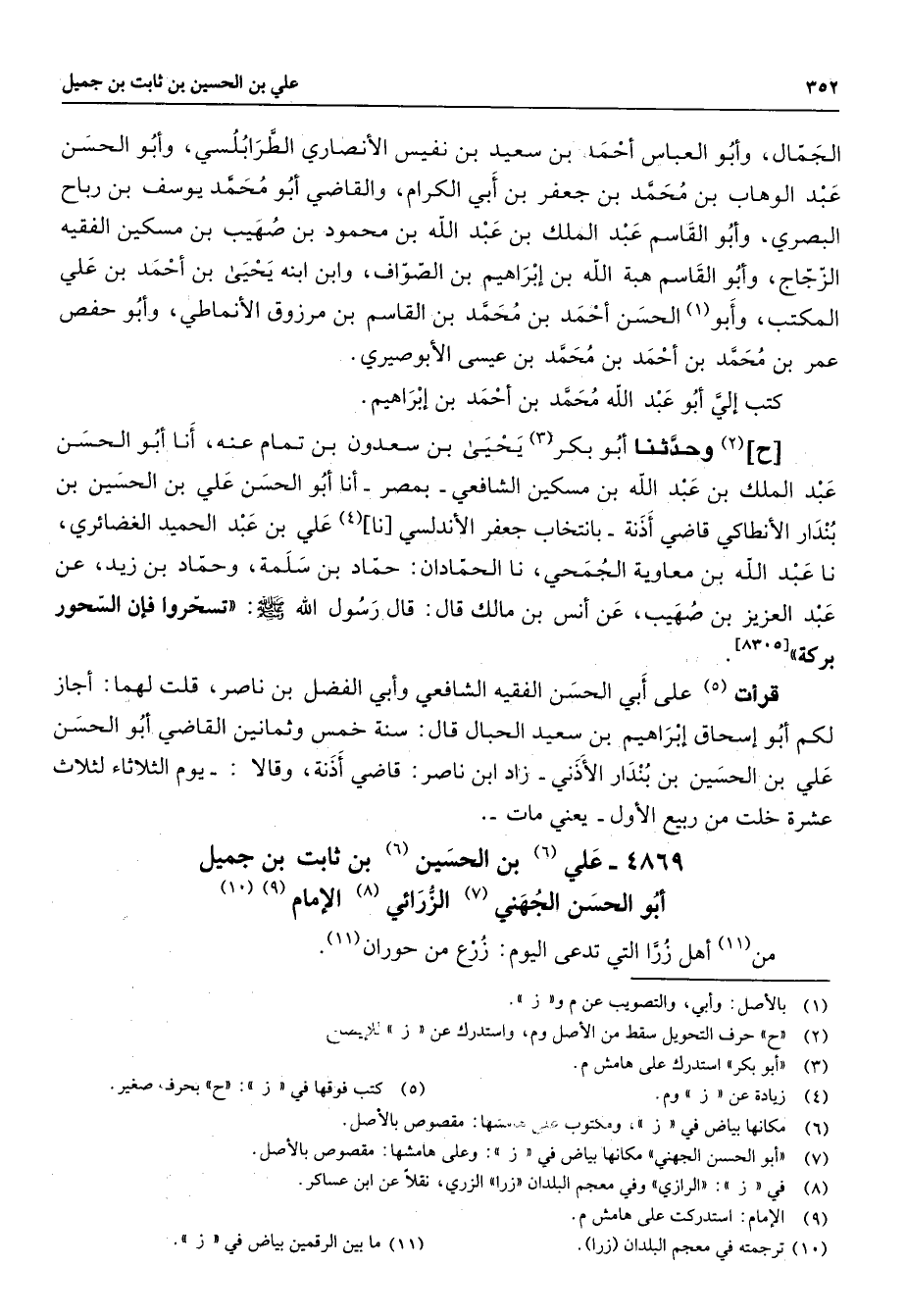 4869 - علي (6) بن الحسين (6) بن ثابت بن جميل أبو الحسن الجهني (7) الزرائي (8) الإمام (9) (10) من أهل زرا التي تدعى اليوم زرع من حوران (11)