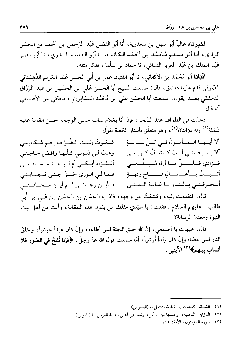 أخبرناه عاليا أبو سهل بن سعدوية أنا أبو الفضل عبد الرحمن بن أحمد بن الحسن الرازي أنا أبو مسلم محمد بن أحمد الكاتب نا أبو القاسم البغوي نا أبو نصر عبد الملك بن عبد العزيز النسائي نا حماد بن سلمة فذكر مثله أنبأنا أبو محمد بن الأكفاني نا أبو الفتيان عمر بن أبي الحسن عبد الكريم الدهستاني الصوفي قدم علينا دمشق قال سمعت الشيخ أبا الحسن علي بن الحسين بن عبد الرزاق الدمشقي بصيدا يقول سمعت أبا الحسن علي بن محمد النيسابوري يحكي عن الأصمعي أنه قال دخلت في الطواف عند السحر فإذا أنا بغلام شاب حسن الوجه حسن القامة عليه شملة (1) وله ذؤابتان (2) وهو متعلق بأستار الكعبة يقول * ألا أيها المأمول في كل ساعة * شكوت إليك الضر فارحم شكايتي ألا يا رجائي أنت كاشف كربتي * وهب لي ذنوبي كلها واقض حاجتي فزادي قليل ما أراه مبلغي * أللزاد أبكي أم لبعد مسافتي أتيت بأعمال قباح ردية * فما لي الورى خلق جنى كجنايتي أتحرقني بالنار يا غاية المنى * فأين رجائي ثم أين مخافتي * قال فتقدمت إليه وكشفت عن وجهه فإذا به الحسن بن الحسن بن علي بن أبي طالب عليهم السلام فقلت يا سيدي مثلك من يقول هذه المقالة وأنت من أهل بيت النبوة ومعدن الرسالة قال هيهات يا أصمعي إن الله خلق الجنة لمن أطاعه وإن كان عبدا حبشيا وخلق النار لمن عصاه وإن كان ولدا قرشيا أما سمعت قول الله عز وجل " فإذا نفخ في الصور فلا أنساب بينهم " (3) الآيتين