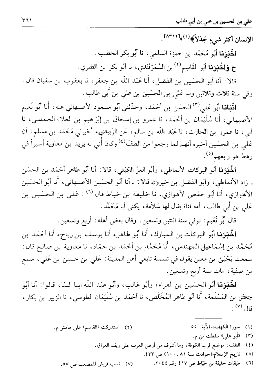 " الإنسان أكثر شئ جدلا (1) " أخبرنا أبو محمد بن حمزة السلمي نا أبو بكر الخطيب ح وأخبرنا أبو القاسم (2) بن السمرقندي نا أبو بكر بن الطبري قالا أنا أبو الحسين بن الفضل أنا عبد الله بن جعفر نا يعقوب بن سفيان قال وفي سنة ثلاث وثلاثين ولد علي بن الحسين بن علي بن أبي طالب أنبأنا أبو (3) علي الحسن بن أحمد وحدثني أبو مسعود الأصبهاني عنه أنا أبو نعيم الأصبهاني أنا سليمان بن أحمد نا عمرو بن إسحاق بن إبراهيم بن العلاء الحمصي نا أبي نا عمرو بن الحارث نا عبد الله بن سالم عن الزبيدي أخبرني محمد بن مسلم أن علي بن الحسين أخبره أنهم لما رجعوا من الطف (4) وكان أتي به يزيد بن معاوية أسيرا في رهط هو رابعهم (5) أخبرنا أبو البركات الأنماطي وأبو العز الكيلي قالا أنا أبو طاهر أحمد بن الحسن زاد الأنماطي وأبو الفضل بن خيرون قالا أنا أبو الحسين الأصبهاني أنا أبو الحسين الأهوازي أنا أبو حفص الأهوازي نا خليفة بن خياط قال (6) علي بن الحسين بن علي بن أبي طالب أمه فتاة يقال لها سلامة يكنى أبا محمد قال أبو نعيم توفي سنة اثنتين وتسعين وقال بعض أهله أربع وتسعين أخبرنا أبو البركات بن المبارك أنا أبو طاهر أنا يوسف بن رباح أنا أحمد بن محمد بن إسماعيل المهندس أنا محمد بن أحمد بن حماد نا معاوية بن صالح قال سمعت يحيى بن معين يقول في تسمية تابعي أهل المدينة علي بن حسين بن علي سمع من صفية مات سنة أربع وتسعين أخبرنا أبو الحسين بن الفراء وأبو غالب وأبو عبد الله ابنا البنا قالوا أنا أبو جعفر بن المسلمة أنا أبو طاهر المخلص نا أحمد بن سليمان الطوسي نا الزبير بن بكار قال (7)