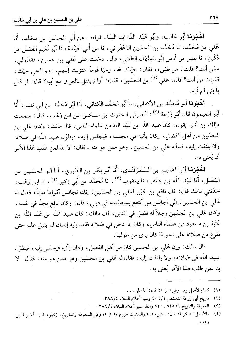 أخبرنا أبو غالب وأبو عبد الله ابنا البنا قراءة عن أبي الحسن بن مخلد أنا علي بن محمد نا محمد بن الحسين الزعفراني نا ابن أبي خيثمة نا أبو نعيم الفضل بن دكين نا نصر بن أوس أبو المنهال الطائي قال دخلت على علي بن حسين فقال لي ممن أنت قلت من طيئ فقال حياك الله وحيا قوما أعتزبت إليهم نعم الحي حيك قلت من أنت قال علي (1) بن الحسين قلت أولم يقتل بالعراق مع أبيه قال لو قتل يا بني لم تره أخبرنا أبو محمد بن الأكفاني نا أبو محمد الكتاني أنا أبو محمد بن أبي نصر أنا أبو الميمون قال أبو زرعة (2) أخبرني الحارث بن مسكين عن ابن وهب قال سمعت مالك بن أنس يقول كان عبيد الله بن عبد الله من علماء الناس قال مالك وكان علي بن الحسين من أهل الفضل وكان يأتيه في مجلسه فيجلس إليه فيطول عبيد الله في صلاته ولا يلتفت إليه فسأله علي بن الحسين وهو ممن هو منه فقال لا بد لمن طلب هذا الأمر أن يعنى به أخبرنا أبو القاسم بن السمرقندي أنا أبو بكر بن الطبري أنا أبو الحسين بن الفضل أنا عبد الله بن جعفر نا يعقوب (3) نا محمد بن أبي زكير (4) نا ابن وهب حدثني مالك قال قال نافع بن جبير لعلي بن الحسين إنك تجالس أقواما دونا فقال له علي بن الحسين إني أجالس من أنتفع بمجالسته في ديني قال وكان نافع يجد في نفسه وكان علي بن الحسين رجلا له فضل في الدين قال ماك كان عبيد الله بن عبد الله بن عتبة بن مسعود من علماء الناس وكان إذا دخل في صلاته فقعد إليه إنسان لم يقبل عليه حتى يفرغ من صلاته على نحو ما كان يرى من طولها قال مالك وإن علي بن الحسين كان من أهل الفضل وكان يأتيه فيجلس إليه فيطول عبيد الله في صلاته ولا يلتفت إليه فقال له علي بن الحسين وهو ممن هو منه فقال لا بد لمن طلب هذا الأمر يعنى به