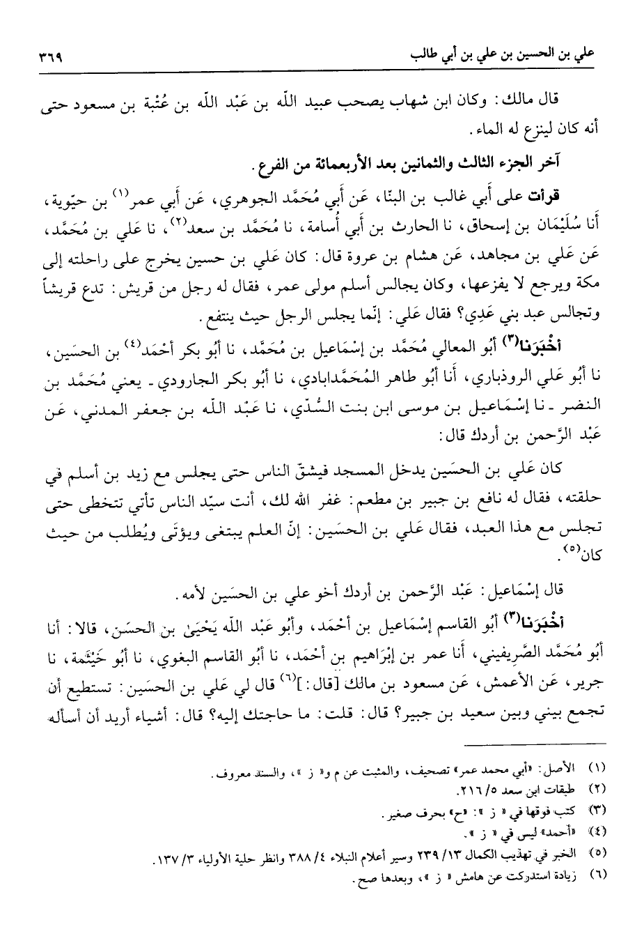 قال مالك وكان ابن شهاب يصحب عبيد الله بن عبد الله بن عتبة بن مسعود حتى أنه كان لينزع له الماء آخر الجزء الثالث والثمانين بعد الأربعمائة من الفرع قرأت على أبي غالب بن البنا عن أبي محمد الجوهري عن أبي عمر (1) بن حيوية أنا سليمان بن إسحاق نا الحارث بن أبي أسامة نا محمد بن سعد (2) نا علي بن محمد عن علي بن مجاهد عن هشام بن عروة قال كان علي بن حسين يخرج على راحلته إلى مكة ويرجع لا يفزعها وكان يجالس أسلم مولى عمر فقال له رجل من قريش تدع قريشا وتجالس عبد بني عدي فقال علي إنما يجلس الرجل حيث ينتفع أخبرنا (3) أبو المعالي محمد بن إسماعيل بن محمد نا أبو بكر أحمد (4) بن الحسين نا أبو علي الروذباري أنا أبو طاهر المحمدابادي نا أبو بكر الجارودي يعني محمد بن النضر نا إسماعيل بن موسى ابن بنت السدي نا عبد الله بن جعفر المدني عن عبد الرحمن بن أردك قال كان علي بن الحسين يدخل المسجد فيشق الناس حتى يجلس مع زيد بن أسلم في حلقته فقال له نافع بن جبير بن مطعم غفر الله لك أنت سيد الناس تأتي تتخطى حتى تجلس مع هذا العبد فقال علي بن الحسين إن العلم يبتغي ويؤتى ويطلب من حيث كان (5) قال إسماعيل عبد الرحمن بن أردك أخو علي بن الحسين لأمه أخبرنا (3) أبو القاسم إسماعيل بن أحمد وأبو عبد الله يحيى بن الحسن قالا أنا أبو محمد الصريفيني أنا عمر بن إبراهيم بن أحمد نا أبو القاسم البغوي نا أبو خيثمة نا جرير عن الأعمش عن مسعود بن مالك قال (6) قال لي علي بن الحسين تستطيع أن تجمع بيني وبين سعيد بن جبير قال قلت ما حاجتك إليه قال أشياء أريد أن أسأله