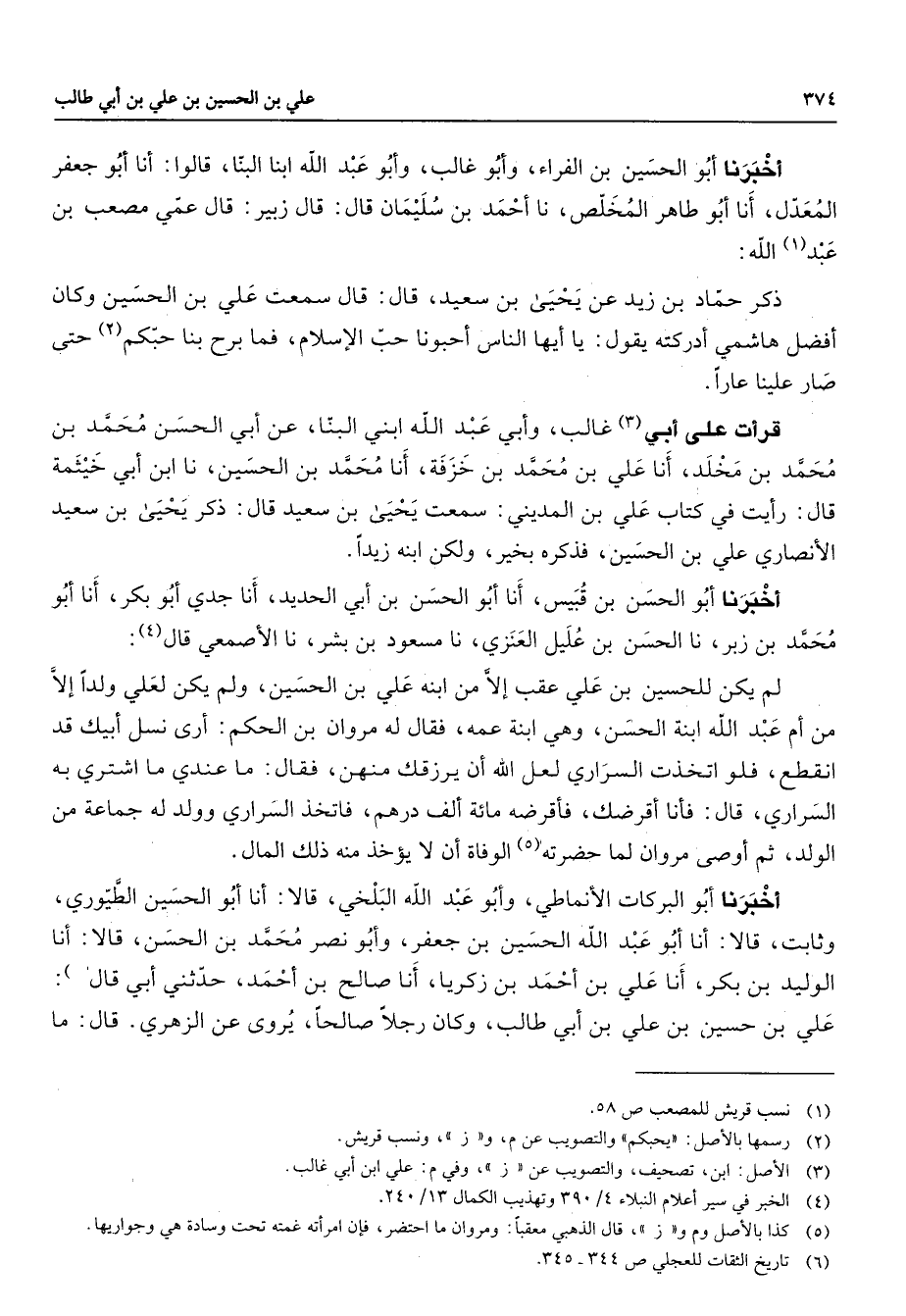 أخبرنا أبو الحسين بن الفراء وأبو غالب وأبو عبد الله ابنا البنا قالوا أنا أبو جعفر المعدل أنا أبو طاهر المخلص نا أحمد بن سليمان قال قال زبير قال عمي مصعب بن عبد (1) الله ذكر حماد بن زيد عن يحيى بن سعيد قال قال سمعت علي بن الحسين وكان أفضل هاشمي أدركته يقول يا أيها الناس أحبونا حب الإسلام فما برح بنا حبكم (2) حتى صار علينا عارا قرأت على أبي (3) غالب وأبي عبد الله ابني البنا عن أبي الحسن محمد بن محمد بن مخلد أنا علي بن محمد بن خزفة أنا محمد بن الحسين نا ابن أبي خيثمة قال رأيت في كتاب علي بن المديني سمعت يحيى بن سعيد قال ذكر يحيى بن سعيد الأنصاري علي بن الحسين فذكره بخير ولكن ابنه زيدا أخبرنا أبو الحسن بن قبيس أنا أبو الحسن بن أبي الحديد أنا جدي أبو بكر أنا أبو محمد بن زبر نا الحسن بن عليل العنزي نا مسعود بن بشر نا الأصمعي قال (4) لم يكن للحسين بن علي عقب إلا من ابنه علي بن الحسين ولم يكن لعلي ولدا إلا من أم عبد الله ابنة الحسن وهي ابنة عمه فقال له مروان بن الحكم أرى نسل أبيك قد انقطع فلو اتخذت السراري لعل الله أن يرزقك منهن فقال ما عندي ما اشتري به السراري قال فأنا أقرضك فأقرضه مائة ألف درهم فاتخذ السراري وولد له جماعة من الولد ثم أوصى مروان لما حضرته (5) الوفاة أن لا يؤخذ منه ذلك المال أخبرنا أبو البركات الأنماطي وأبو عبد الله البلخي قالا أنا أبو الحسين الطيوري وثابت قالا أنا أبو عبد الله الحسين بن جعفر وأبو نصر محمد بن الحسن قالا أنا الوليد بن بكر أنا علي بن أحمد بن زكريا أنا صالح بن أحمد حدثني أبي قال علي بن حسين بن علي بن أبي طالب وكان رجلا صالحا يروى عن الزهري قال ما