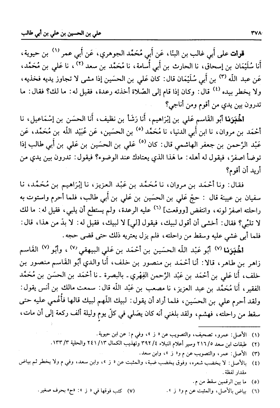 قرأت على أبي غالب بن البنا عن أبي محمد الجوهري عن أبي عمر (1) بن حيوية أنا سليمان بن إسحاق نا الحارث بن أبي أسامة نا محمد بن سعد (2) نا علي بن محمد عن عبد الله (3) بن أبي سليمان قال كان علي بن الحسين إذا مشى لا تجاوز يديه فخذيه ولا يخطر بيده (4) قال وكان إذا قام إلى الصلاة أخذته رعدة فقيل له ما لك فقال ما تدرون بين يدي من أقوم ومن أناجي أخبرنا أبو القاسم علي بن إبراهيم أنا رشأ بن نظيف أنا الحسن بن إسماعيل نا أحمد بن مروان نا ابن أبي الدنيا نا محمد (5) بن الحسين عن عبيد الله بن محمد عن عبد الرحمن بن جعفر الهاشمي قال كان (5) علي بن الحسين بن علي بن أبي طالب إذا توضأ اصفر فيقول له أهله ما هذا الذي يعتادك عند الوضوء فيقول تدرون بين يدي من أريد أن أقوم فقال ونا أحمد بن مروان نا محمد بن عبد العزيز نا إبراهيم بن محمد نا سفيان بن عيينة قال حج علي بن الحسين بن علي بن أبي طالب فلما أحرم واستوت به راحلته اصفر لونه وانتفض ووقعت (6) عليه الرعدة ولم يستطع أن يلبي فقيل له مالك لا تلبي فقال أخشى أن أقول لبيك فيقول لي لا لبيك فقيل له لا بد من هذا قال فلما أبي غشي عليه وسقط من راحلته فلم يزل يعتريه ذلك حتى قضى حجه أخبرنا (7) أبو عبد الله الحسين بن أحمد بن علي البيقهي (7) وأبو (7) القاسم زاهر بن طاهر قالا أنا أحمد بن منصور بن خلف أنا والدي أبو القاسم منصور بن خلف أنا علي بن أحمد بن عبد الرحمن الفهري بالبصرة نا أحمد بن الحسن بن محمد الفقير أنا محمد بن عبد العزيز نا مصعب بن عبد الله قال سمعت مالك بن أنس يقول ولقد أحرم علي بن الحسين فلما أراد أن يقول لبيك اللهم لبيك قالها فأغمي عليه حتى سقط من راحلته فهشم ولقد بلغني أنه كان يصلي في كل يوم وليلة ألف ركعة إلى أن مات
