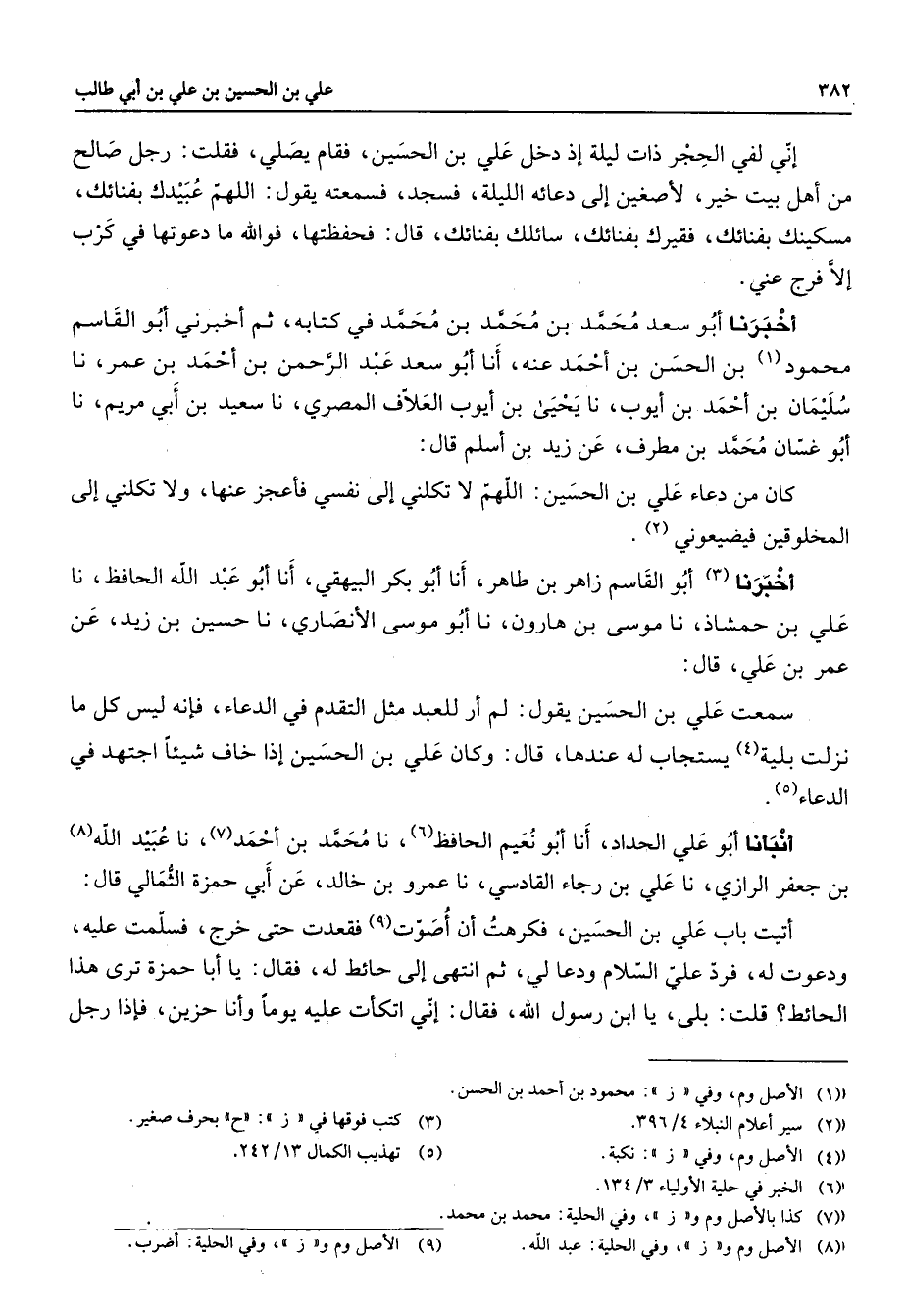 إني لفي الحجر ذات ليلة إذ دخل علي بن الحسين فقام يصلي فقلت رجل صالح من أهل بيت خير لأصغين إلى دعائه الليلة فسجد فسمعته يقول اللهم عبيدك بفنائك مسكينك بفنائك فقيرك بفنائك سائلك بفنائك قال فحفظتها فوالله ما دعوتها في كرب إلا فرج عني أخبرنا أبو سعد محمد بن محمد بن محمد في كتابه ثم أخبرني أبو القاسم محمود (1) بن الحسن بن أحمد عنه أنا أبو سعد عبد الرحمن بن أحمد بن عمر نا سليمان بن أحمد بن أيوب نا يحيى بن أيوب العلاف المصري نا سعيد بن أبي مريم نا أبو غسان محمد بن مطرف عن زيد بن أسلم قال كان من دعاء علي بن الحسين اللهم لا تكلني إلى نفسي فأعجز عنها ولا تكلني إلى المخلوقين فيضيعوني (2) أخبرنا (3) أبو القاسم زاهر بن طاهر أنا أبو بكر البيهقي أنا أبو عبد الله الحافظ نا علي بن حمشاذ نا موسى بن هارون نا أبو موسى الأنصاري نا حسين بن زيد عن عمر بن علي قال سمعت علي بن الحسين يقول لم أر للعبد مثل التقدم في الدعاء فإنه ليس كل ما نزلت بلية (4) يستجاب له عندها قال وكان علي بن الحسين إذا خاف شيئا اجتهد في الدعاء (5) أنبأنا أبو علي الحداد أنا أبو نعيم الحافظ (6) نا محمد بن أحمد (7) نا عبيد الله (8) بن جعفر الرازي نا علي بن رجاء القادسي نا عمرو بن خالد عن أبي حمزة الثمالي قال أتيت باب علي بن الحسين فكرهت أن أصوت (9) فقعدت حتى خرج فسلمت عليه ودعوت له فرد علي السلام ودعا لي ثم انتهى إلى حائط له فقال يا أبا حمزة ترى هذا الحائط قلت بلى يا ابن رسول الله فقال إني اتكأت عليه يوما وأنا حزين فإذا رجل