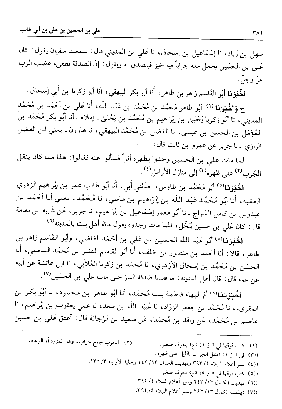 سهل سهل بن زياد نا إسماعيل بن إسحاق نا علي بن المديني قال سمعت سفيان يقول كان علي بن الحسين يجعل معه جرابا فيه خبز فيتصدق به ويقول إن الصدقة تطفئ غضب الرب عزوجل أخبرنا أبو القاسم زاهر بن طاهر أنا أبو بكر البيهقي أنا أبو زكريا بن أبي إسحاق ح وأخبرنا (1) أبو طاهر محمد بن محمد بن عبد الله أنا علي بن أحمد بن محمد المديني نا أبو زكريا يحيى بن إبراهيم بن محمد بن يحيى إملاء أنا أبو بكر محمد بن المؤمل بن الحسن بن عيسى نا الفضل بن محمد البيهقي نا هارون يعني ابن الفضل الرازي نا جرير عن عمرو بن ثابت قال لما مات علي بن الحسين وجدوا بظهره أثرا فسألوا عنه فقالوا هذا مما كان ينقل الجرب (2) على ظهره (3) إلى منازل الأرامل (4)