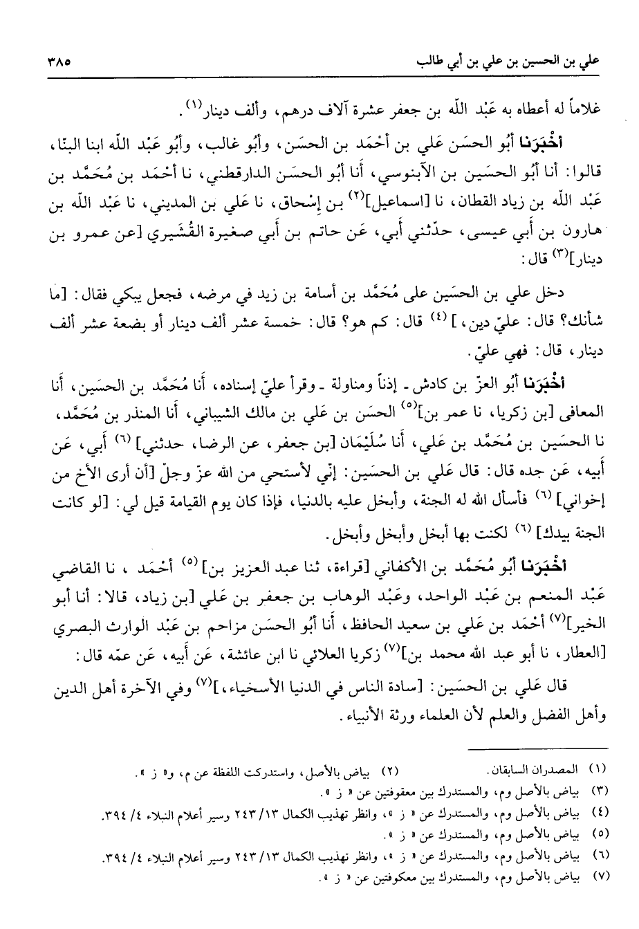 غلاما له أعطاه به عبد الله بن جعفر عشرة آلاف درهم وألف دينار (1) أخبرنا أبو الحسن علي بن أحمد بن الحسن وأبو غالب وأبو عبد الله ابنا البنا قالوا أنا أبو الحسين بن الآبنوسي أنا أبو الحسن الدارقطني نا أحمد بن محمد بن عبد الله بن زياد القطان نا إسماعيل (2) بن إسحاق نا علي بن المديني نا عبد الله بن هارون بن أبي عيسى حدثني أبي عن حاتم بن أبي صغيرة القشيري عن عمرو بن دينار (3) قال دخل علي بن الحسين على محمد بن أسامة بن زيد في مرضه فجعل يبكي فقال ما شأنك قال علي دين (4) قال كم هو قال خمسة عشر ألف دينار أو بضعة عشرة ألف دينار قال فهي علي أخبرنا أبو العز بن كادش إذنا ومناولة وقرأ علي إسناده أنا محمد بن الحسين أنا المعافى بن زكريا نا عمر بن (5) الحسن بن علي بن مالك الشيباني أنا المنذر بن محمد نا الحسين بن محمد بن علي أنا سليمان بن جعفر عن الرضا حدثني (6) أبي عن أبيه عن جده قال قال علي بن الحسين إني لأستحي من الله عز وجل أن أرى الأخ من إخواني (6) فأسأل الله له الجنة وأبخل عليه بالدنيا فإذا كان يوم القيامة قيل لي لو كانت الجنة بيدك (6) لكنت بها أبخل وأبخل وأبخل أخبرنا أبو محمد بن الأكفاني قراءة ثنا عبد العزيز بن (5) أحمد نا القاضي عبد المنعم بن عبد الواحد وعبد الوهاب بن جعفر بن علي بن زياد قالا أنا أبو الخير (7) أحمد بن علي بن سعيد الحافظ أنا أبو الحسن مزاحم بن عبد الوارث البصري العطار نا أبو عبد الله محمد بن (7) زكريا العلائي نا ابن عائشة عن أبيه عن عمه قال قال علي بن الحسين سادة الناس في الدنيا الأسخياء (7) وفي الآخرة أهل الدين وأهل الفضل والعلم لأن العلماء ورثة الأنبياء