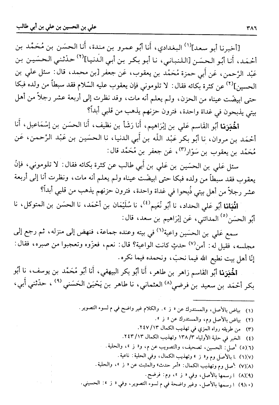 أخبرنا أبو سعد (1) البغدادي أنا أبو عمرو بن مندة أنا الحسن بن محمد بن أحمد أنا أبو الحسن اللنباني نا أبو بكر بن أبي الدنيا (2) حدثني الحسين بن عبد الرحمن عن أبي حمزة محمد بن يعقوب عن جعفر بن محمد قال سئل علي بن الحسين (2) عن كثرة بكائه فقال لا تلوموني فإن يعقوب عليه السلام فقد سبطا من ولده فبكا حتى ابيضت عيناه من الحزن ولم يعلم أنه مات وقد نظرت إلى أربعة عشر رجلا من أهل بيتي يذبحون في غداة واحد فترون حزنهم يذهب من قلبي أبدا أخبرنا أبو القاسم علي بن إبراهيم أنا رشأ بن نظيف أنا الحسن بن إسماعيل أنا أحمد بن مروان نا أبو بكر عبد الله بن أبي الدنيا نا الحسين بن عبد الرحمن عن محمد بن يعقوب بن سوار (3) عن جعفر بن محمد قال سئل علي بن الحسين بن علي بن أبي طالب عن كثرة بكائه فقال لا تلوموني فإن يعقوب فقد سبطا من ولده فبكا حتى ابيضت عيناه ولم يعلم أنه مات ونظرت أنا إلى أربعة عشر رجلا من أهل بيتي ذبحوا في غداة واحدة فترون حزنهم يذهب من قلبي أبدا أنبأنا أبو علي الحداد نا أبو نعيم (4) نا سليمان بن أحمد نا الحسن بن المتوكل نا أبو الحسن (5) المدائني عن إبراهيم بن سعد قال سمع علي بن الحسين واعية (6) في بيته وعنده جماعة فنهض إلى منزله ثم رجع إلى مجلسه فقيل له أمن (7) حدث كانت الواعية قال نعم فعزوه وتعجبوا من صبره فقال إنا أهل بيت نطيع الله فيما نحب ونحمده فيما نكره أخبرنا أبو القاسم زاهر بن طاهر أنا أبو بكر البيهقي أنا أبو محمد بن يوسف نا أبو بكر أحمد بن سعيد بن فرضي (8) العثماني نا طاهر بن يحيى الحسني (9) حدثني أبي