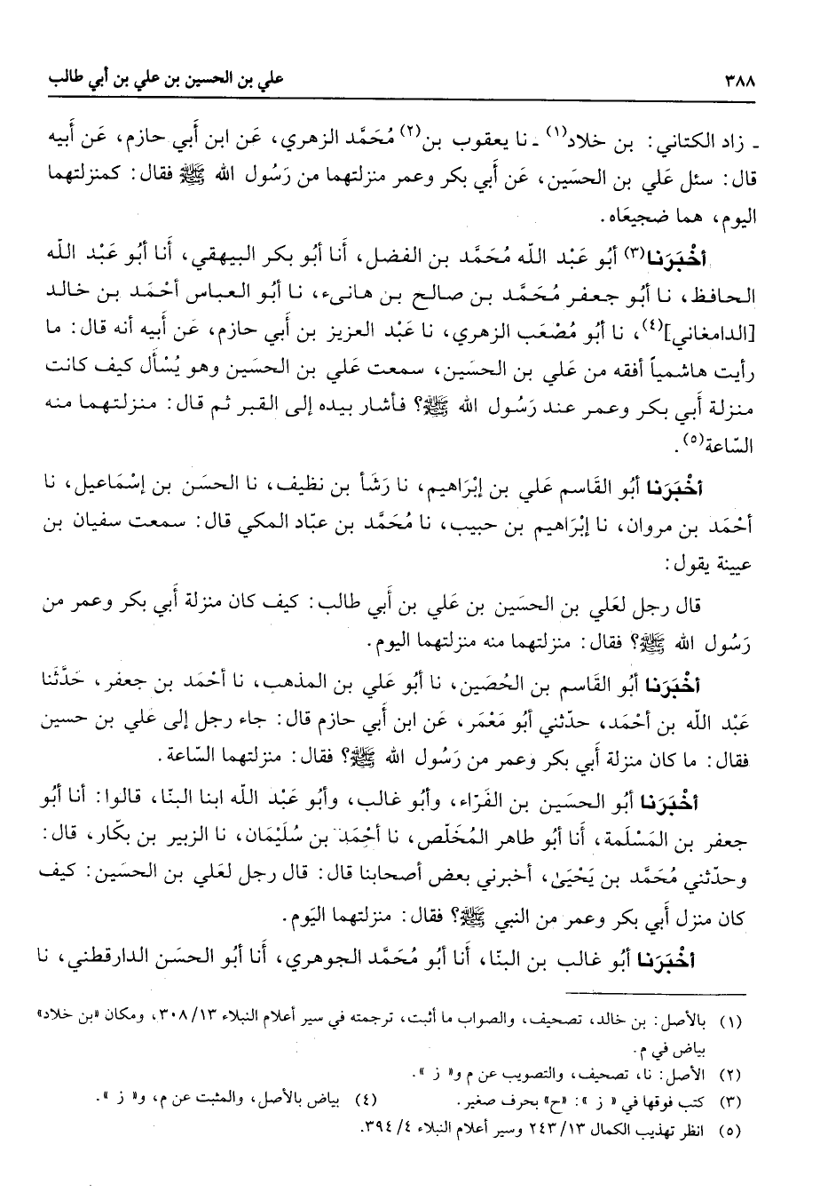 زاد الكتاني بن خلاد (1) نا يعقوب بن محمد (2) الزهري عن ابن أبي حازم عن أبيه قال سئل علي بن الحسين عن أبي بكر وعمر منزلتهما من رسول الله (صلى الله عليه وسلم) فقال كمنزلتهما اليوم هما ضجيعاه أخبرنا (3) أبو عبد الله محمد بن الفضل أنا أبو بكر البيهقي أنا أبو عبد الله الحافظ نا أبو جعفر محمد بن صالح بن هانئ نا أبو العباس أحمد بن خالد الدامغاني (4) نا أبو مصعب الزهري نا عبد العزيز بن أبي حازم عن أبيه أنه قال ما رأيت هاشميا أفقه من علي بن الحسين سمعت علي بن الحسين وهو يسأل كيف كانت منزلة أبي بكر وعمر عند رسول الله (صلى الله عليه وسلم) فأشار بيده إلى القبر ثم قال منزلتهما منه الساعة (5) أخبرنا أبو القاسم علي بن إبراهيم نا رشأ بن نظيف نا الحسن بن إسماعيل نا أحمد بن مروان نا إبراهيم بن حبيب نا محمد بن عباد المكي قال سمعت سفيان بن عيينة يقول قال رجل لعلي بن الحسين بن علي بن أبي طالب كيف كان منزلة أبي بكر وعمر من رسول الله (صلى الله عليه وسلم) فقال منزلتهما منه منزلتهما اليوم أخبرنا أبو القاسم بن الحصين نا أبو علي بن المذهب نا أحمد بن جعفر حدثنا عبد الله بن أحمد حدثني أبو معمر عن ابن أبي حازم قال جاء رجل إلى علي بن حسين فقال ما كان منزلة أبي بكر وعمر من رسول الله (صلى الله عليه وسلم) فقال منزلتهما الساعة أخبرنا أبو الحسين بن الفراء وأبو غالب وأبو عبد الله ابنا البنا قالوا أنا أبو جعفر بن المسلمة أنا أبو طاهر المخلص نا أحمد بن سليمان نا الزبير بن بكار قال وحدثني محمد بن يحيى أخبرني بعض أصحابنا قال قال رجل لعلي بن الحسين كيف كان منزل أبي بكر وعمر من النبي (صلى الله عليه وسلم) فقال منزلتهما اليوم أخبرنا أبو غالب بن البنا أنا أبو محمد الجوهري أنا أبو الحسن الدارقطني نا