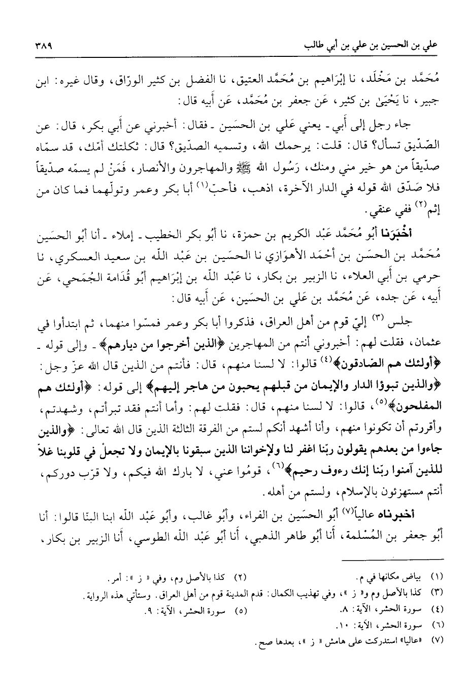 محمد بن مخلد نا إبراهيم بن محمد العتيق نا الفضل بن كثير الوراق وقال غيره ابن جبير نا يحيى بن كثير عن جعفر بن محمد عن أبيه قال جاء رجل إلى أبي يعني علي بن الحسين فقال أخبرني عن أبي بكر قال عن الصديق تسأل قال قلت يرحمك الله وتسميه الصديق قال ثكلتك أمك قد سماه صديقا من هو خير مني ومنك رسول الله (صلى الله عليه وسلم) والمهاجرون والأنصار فمن لم يسمه صديقا فلا صدق الله قوله في الدار الآخرة اذهب فأحب (1) أبا بكر وعمر وتولهما فما كان من إثم (2) ففي عنقي أخبرنا أبو محمد عبد الكريم بن حمزة نا أبو بكر الخطيب إملاء أنا أبو الحسين محمد بن الحسن بن أحمد الأهوازي نا الحسين بن عبد الله بن سعيد العسكري نا حرمي بن أبي العلاء نا الزبير بن بكار نا عبد الله بن إبراهيم أبو قدامة الجمحي عن أبيه عن جده عن محمد بن علي بن الحسين عن أبيه قال جلس (3) إلي قوم من أهل العراق فذكروا أبا بكر وعمر فمسوا منهما ثم ابتدأوا في عثمان فقلت لهم أخبروني أنتم من المهاجرين " الذين أخرجوا من ديارهم " وإلى قوله " أولئك هم الصادقون " (4) قالوا لا لسنا منهم قال فأنتم من الذين قال الله عز وجل " والذين تبوءوا الدار والإيمان من قبلهم يحبون من هاجر إليهم " إلى قوله " أولئك هم المفلحون " (5) قالوا لا لسنا منهم قال فقلت لهم وأما أنتم فقد تبرأتم وشهدتم وأقررتم أن تكونوا منهم وأنا أشهد أنكم لستم من الفرقة الثالثة الذين قال الله تعالى " والذين جاءوا من بعدهم يقولون ربنا اغفر لنا ولإخواننا الذين سبقونا بالإيمان ولا تجعل في قلوبنا غلا للذين آمنوا ربنا إنك رءوف رحيم " (6) قوموا عني لا بارك الله فيكم ولا قرب دوركم أنتم مستهزئون بالإسلام ولستم من أهله أخبرناه عاليا (7) أبو الحسين بن الفراء وأبو غالب وأبو عبد الله ابنا ابنا قالوا أنا أبو جعفر بن المسلمة أنا أبو طاهر الذهبي أنا أبو عبد الله الطوسي أنا الزبير بن بكار