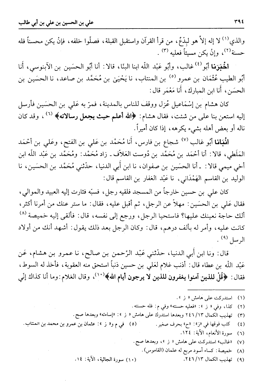 والذي (1) لا إله إلا هو لبدع من قرأ القرآن واستقبل القبلة فصلوا خلفه فإن يكن محسنا فله حسنة (2) وإن يكن مسيئا فعليه (3) أخبرنا أبو (4) غالب وأبو عبد الله ابنا البنا قالا أنا أبو الحسين بن الآبنوسي أنا أبو الطيب عثمان بن عمرو (5) بن المنتاب نا يحيى بن محمد بن صاعد نا الحسين بن الحسن أنا ابن المبارك أنا معمر قال كان هشام بن إسماعيل عزل ووقف للناس بالمدينة فمر به علي بن الحسين فأرسل إليه استعن بنا على من شئت فقال هشام " الله أعلم حيث يجعل رسالاته " (6) وقد كان ناله أو بعض أهله بشئ يكرهه إذا كان أميرا أنبأنا أبو غالب (7) شجاع بن فارس أنا محمد بن علي بن الفتح وعلي بن أحمد الملطي قالا أنا أحمد بن محمد بن دوست العلاف زاد محمد ومحمد بن عبد الله ابن أخي ميمي قالا أنا الحسين بن صفوان نا ابن أبي الدنيا حدثني محمد بن الحسين نا الوليد بن القاسم الهمداني نا عبد الغفار بن القاسم قال كان علي بن حسين خارجا من المسجد فلقيه رجل فسبه فثارت إليه العبيد والموالي فقال علي بن الحسين مهلا عن الرجل ثم أقبل عليه فقال ما ستر عنك من أمرنا أكثر ألك حاجة نعينك عليها فاستحيا الرجل ورجع إلى نفسه قال فألقى إليه خميصة (8) كانت عليه وأمر له بألف درهم قال وكان الرجل بعد ذلك يقول أشهد أنك من أولاد الرسل (9) قال ونا ابن أبي الدنيا حدثني عبد الرحمن بن صالح نا عمرو بن هشام عن عبد الله بن عطاء قال أذنب غلام لعلي بن حسين ذنبا استحق منه العقوبة فأخذ له السوط فقال " قل للذين آمنوا يغفرون للذين لا يرجون أيام الله " (10) وقال الغلام وما أنا كذاك إني
