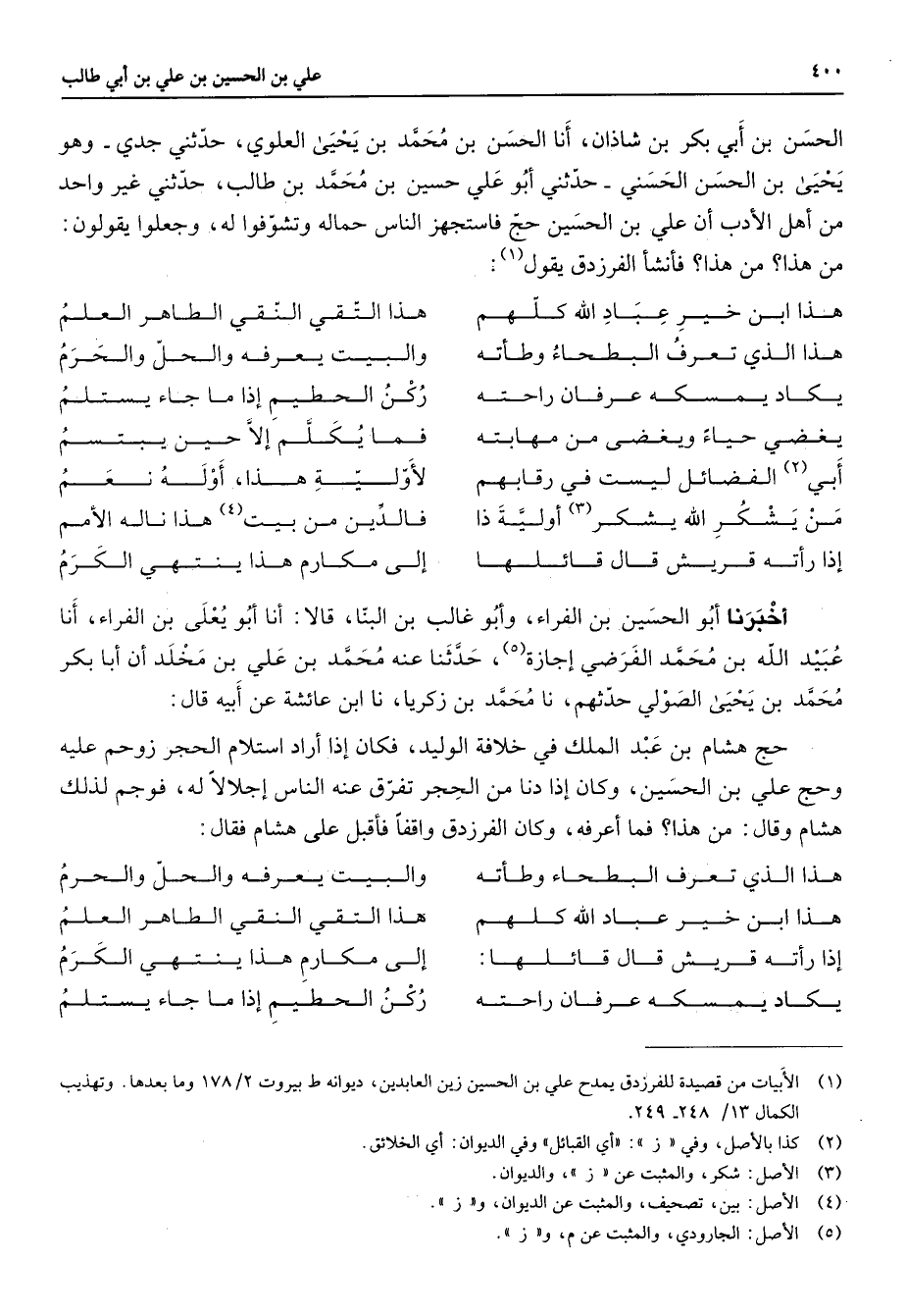 الحسن بن أبي بكر بن شاذان أنا الحسن بن محمد بن يحيى العلوي حدثني جدي وهو يحيى بن الحسن الحسني حدثني أبو علي حسين بن محمد بن طالب حدثني غير واحد من أهل الأدب أن علي بن الحسين حج فاستجهز الناس حماله وتشوفوا له وجعلوا يقولون من هذا من هذا فأنشأ الفرزدق يقول (1) هذا ابن خير عباد الله كلهم * هذ التقي النقي الطاهر العلم هذا الذي تعرف البطحاء وطأته * والبيت يعرفه والحل والحرم يكاد يمسكه عرفان راحته * ركن الحطيم إذا ما جاء يستلم يغضي حياء ويغضى من مهابته * فما يكلم إلا حين يبتسم أبي (2) الفضائل ليست في رقابهم * لأولية هذا أوله نعم من يشكر الله يشكر (3) أولية ذا * فالدين من بيت (4) هذا ناله الأمم إذا رأته قريش قال قائلها * إلى مكارم هذا ينتهي الكرم * أخبرنا أبو الحسين بن الفراء وأبو غالب بن البنا قالا أنا أبو يعلى بن الفراء أنا عبيد الله بن محمد الفرضي إجازة (5) حدثنا عنه محمد بن علي بن مخلد أن أبا بكر محمد بن يحيى الصولي حدثهم نا محمد بن زكريا نا ابن عائشة عن أبيه قال حج هشام بن عبد الملك في خلافة الوليد فكان إذا أراد استلام الحجر زوحم عليه وحج علي بن الحسين وكان إذا دنا من الحجر تفرق عنه الناس إجلالا له فوجم لذلك هشام وقال من هذا فما أعرفه وكان الفرزدق واقفا فأقبل على هشام فقال هذا الذي تعرف البطحاء وطأته * والبيت يعرفه والحل والحرم هذا ابن خير عباد الله كلهم * هذا التقي النقي الطاهر العلم إذا رأته قريش قال قائلها * إلى مكارم هذا ينتهي الكرم يكاد يمسكه عرفان راحته * ركن الحطيم إذا ما جاء يستلم
