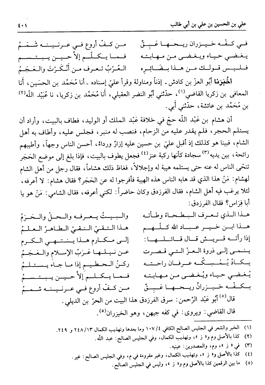 في كفه خيزران ريحها عبق * من كف أروع في عرنينه شمم يغضي حياء ويغضى من مهابته * فما يكلم إلا حين يبتسم فليس قولك من هذا بضائره * العرب تعرف من أنكرت والعجم * أخبرنا أبو العز بن كادش إذنا ومناولة وقرأ علي إسناده أنا محمد بن الحسين أنا المعافى بن زكريا القاضي (1) حدثني أبو النضر العقيلي أنا محمد بن زكريا نا عبيد الله (2) بن محمد بن عائشة حدثني أبي أن هشام بن عبد الله حج في خلافة عبد الملك أو الوليد فطاف بالبيت وأراد أن يستلم الحجر فلم يقدر عليه من الزحام فنصب له منبر فجلس عليه وأطاف به أهل الشام فبينا هو كذلك إذ أقبل علي بن حسين عليه إزار ورداء أحسن الناس وجها وأطيبهم رائحة بين يديه (3) سجادة كأنها ركبة عنز (4) فجعل يطوف بالبيت فإذا بلغ إلى موضع الحجر تنحى الناس له عنه حتى يستلمه هيبة له وإجلالا فغاظ ذلك هشاما فقال رجل من أهل الشام لهشام من هذا الذي قد هابه الناس هذه الهيبة فأفرجوا له عن الحجر فقال هشام لا أعرفه لئلا يرغب فيه أهل الشام فقال الفرزدق وكان حاضرا لكني أعرفه فقال الشامي من هو يا أبا فراس فقال الفرزدق هذا الذي تعرف البطحاء وطأته * والبيت يعرفه والحل والحرم هذا ابن خير عباد الله كلهم * هذا التقي النقي الطاهر العلم إذا رأته قريش قال قائلها * إلى مكارم هذا ينتهي الكرم ينمى إلى ذروة العز التي قصرت * عن نيلها عرب الإسلام والعجم يكاد يمسكه عرفان راحته * ركن الحطيم إذا ما جاء يستلم يغضي حياء ويغضى من مهابته * فما يكلم إلا حين يبتسم بكفه خيزران ريحها عبق * من كف أروع في عرنينه شمم قال أبو عبد الرحمن سرق الفرزدق هذا البيت من الحر بن الديلي قال القاضي ويروى في كفه جيهن وهو الخيزران (5)