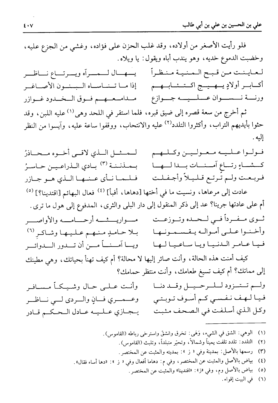 فلو رأيت الأصغر من أولاده وقد غلب الحزن على فؤاده وغشي من الجزع عليه وخضبت الدموع خديه وهو يندب أباه ويقول يا ويلاه لعاينت من قبح المنية منظرا * يهال لمرآه ويرتاع ناظر أكابر أولاد يهيج اكتئابهم * إذا ما تناساه البنون الأصاغر ورنة نسوان عليه جوازع * مدامعهم فوق الخدود غوازر * ثم أخرج من سعة قصره إلى ضيق قبره فلما استقر في اللحد وهي (1) عليه اللبن وقد حثوا بأيديهم التراب وأكثروا التلدد (2) عليه والانتحاب ووقفوا ساعة عليه وآيسوا من النظر إليه فولوا عليه معولين وكلهم * لمثل الذي لاقى أخوه محاذر كشاء رتاع آمنات بدا لها * بمذننة (3) بادي الذراعين حاسر فربعت ولم ترتع قليلا وأجفلت * فلما نأى عنها الذي هو جازر * عادت إلى مرعاها ونسيت ما في أختها دهاها أفبأ (4) فعال البهائم اقتدينا (5) أم على عادتها جرينا عد إلى ذكر المنقول إلى دار البلى والثرى المدفوع إلى هول ما ترى ثوى مفردا في لحده وتوزعت * مواريثه أرحامه والأواصر وأخنوا على أمواله يقسمونها * بلا حامد منهم عليها وشاكر (6) فيا عامر الدنيا ويا ساعيا لها * ويا آمنا من أن تدور الدوائر * كيف أمنت هذه الحالة وأنت صائر إليها لا محالة أم كيف تهنأ بحياتك وهي مطينك إلى مماتك أم كيف تسيغ طعامك وأنت منتظر حمامك ولم تتزود للرحيل وقد دنا * وأنت على حال وشيكا مسافر فيا لهف نفسي كم أسوف توبتي * وعمري فان والردى لي ناظر وكل الذي أسلفت في الصحف مثبت * يجازي عليه عادل الحكم قادر