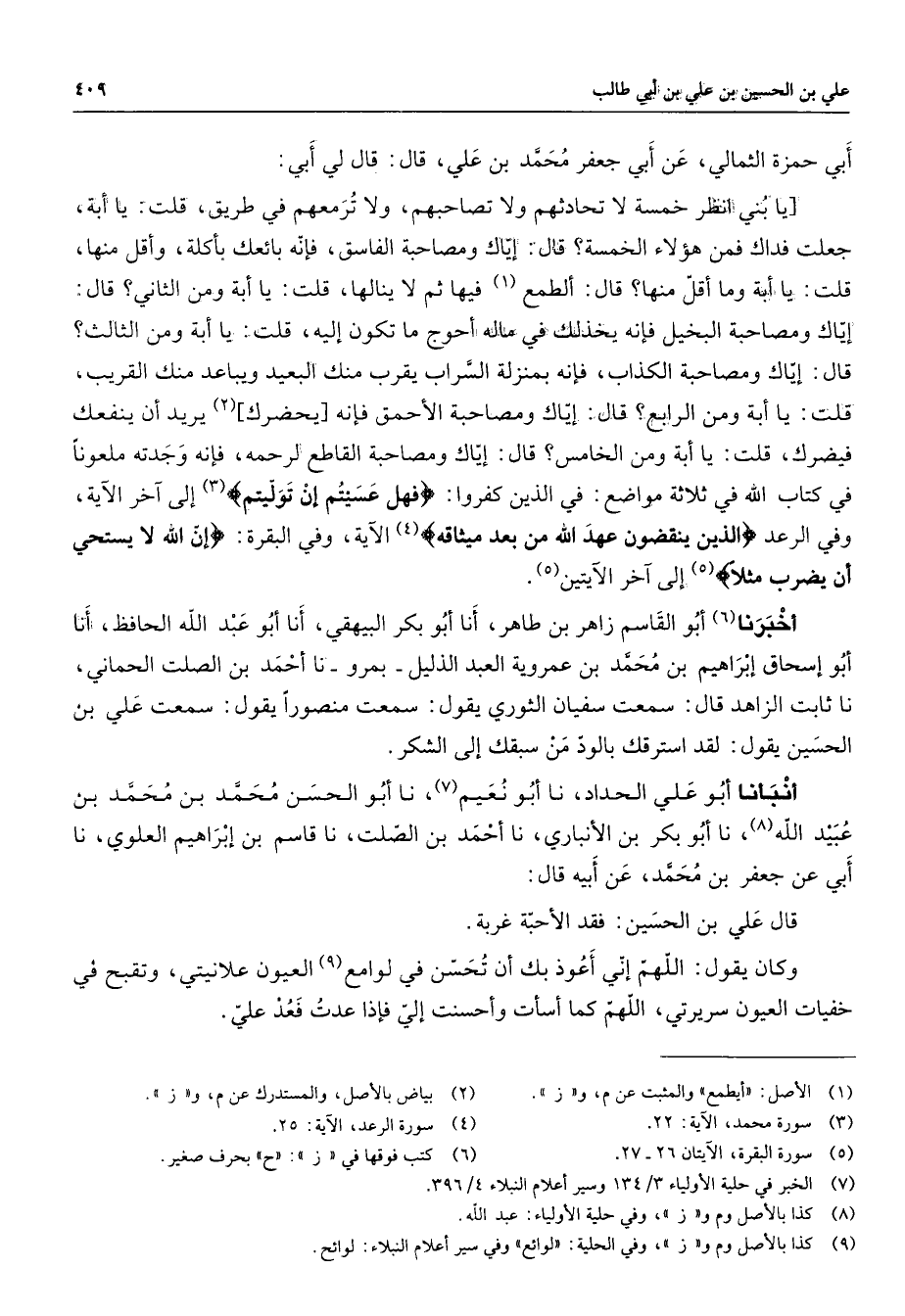 أبي حمزة الثمالي عن أبي جعفر محمد بن علي قال قال لي أبي يا بني انظر خمسة لا تحادثهم ولا تصاحبهم ولا ترمعهم في طريق قلت يا أبة جعلت فداك فمن هؤلاء الخمسة قال إياك ومصاحبة الفاسق فإنه بائعك بأكلة وأقل منها قلت يا أبة وما أقل منها قال الطمع (1) فيها ثم لا ينالها قلت يا أبة ومن الثاني قال إياك ومصاحبة البخيل فإنه يخذلك في ماله أحوج ما تكون إليه قلت يا أبة ومن الثالث قال إياك ومصاحبة الكذاب فإنه بمنزلة السراب يقرب منك البعيد ويباعد منك القريب قلت يا أبة ومن الرابع قال إياك ومصاحبة الأحمق فإنه يحضرك (2) يريد أن ينفعك فيضرك قلت يا أبة ومن الخامس قال إياك ومصاحبة القاطع لرحمه فإنه وجدته ملعونا في كتاب الله في ثلاثة مواضع في الذين كفروا " فهل عسيتم إن توليتم " (3) إلى آخر الآية وفي الرعد " الذين ينقضون عهد الله من بعد ميثاقه " الآية وفي البقرة " إن الله لا يستحي أن يضرب مثلا " (5) إلى آخر الآيتين (5) أخبرنا (6) أبو القاسم زاهر بن طاهر أنا أبو بكر البيهقي أنا أبو عبد الله الحافظ أنا أبو إسحاق إبراهيم بن محمد بن عمروية العبد الذليل بمرو نا أحمد بن الصلت الحماني نا ثابت الزاهد قال سمعت سفيان الثوري يقول سمعت منصورا يقول سمعت علي بن الحسين يقول لقد استرقك بالود من سبقك إلى الشكر أنبأنا أبو علي الحداد نا أبو نعيم (7) نا أبو الحسن محمد بن محمد بن عبيد الله (8) نا أبو بكر بن الأنباري نا أحمد بن الصلت نا قاسم بن إبراهيم العلوي نا أبي عن جعفر بن محمد عن أبيه قال قال علي بن الحسين فقد الأحبة غربة وكان يقول اللهم إني أعوذ بك أن تحسن في لوامع (9) العيون علانيتي وتقبح في خفيات العيون سريرتي اللهم كما أسأت وأحسنت إلى فإذا عدت فعد علي