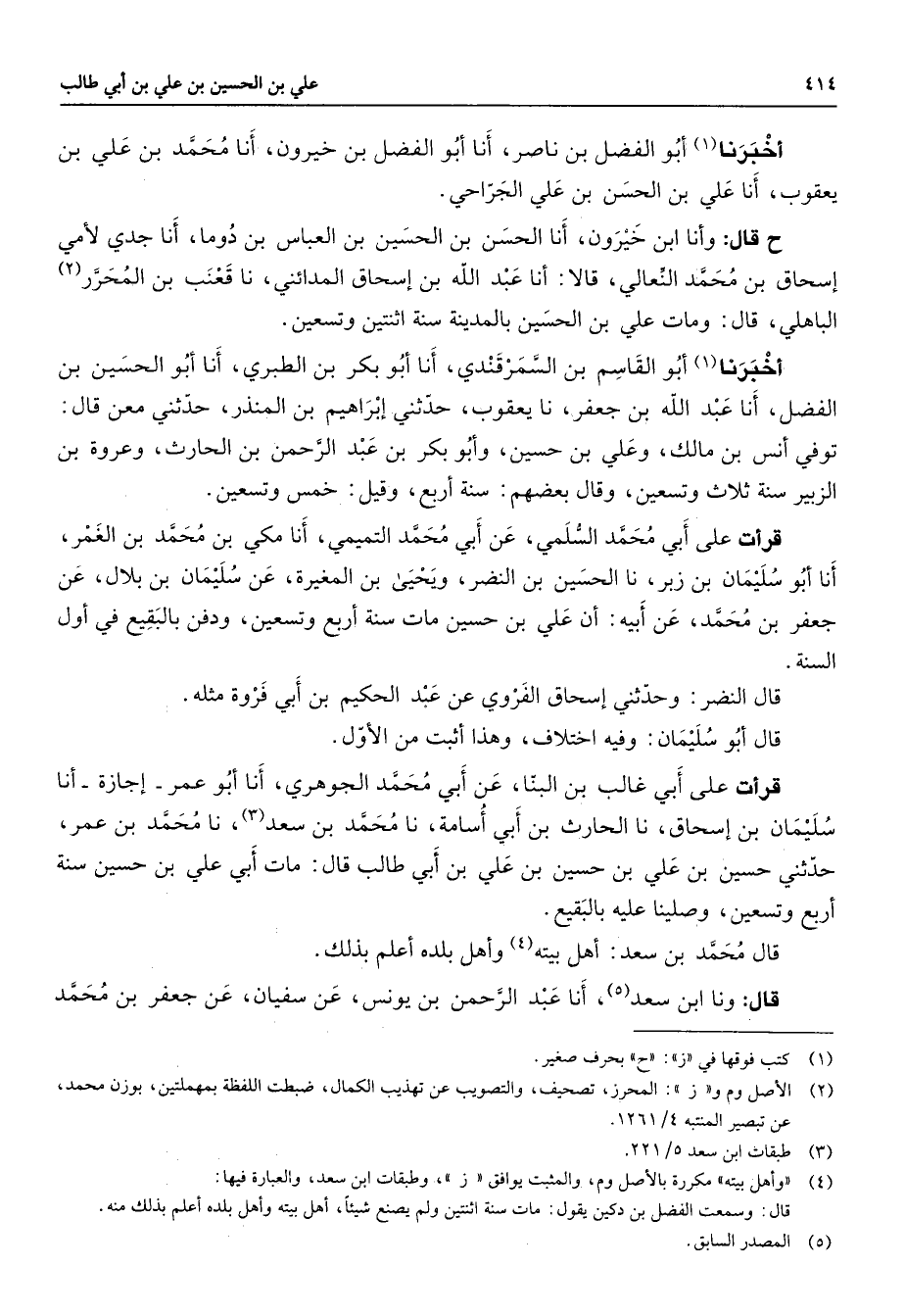 أخبرنا (1) أبو الفضل بن ناصر أنا أبو الفضل بن خيرون أنا محمد بن علي بن يعقوب أنا علي بن الحسن بن علي الجراحي ح قال وأنا ابن خيرون أنا الحسن بن الحسين بن العباس بن دوما أنا جدي لأمي إسحاق بن محمد النعالي قالا أنا عبد الله بن إسحاق المدائني نا قعنب بن المحرر (2) الباهلي قال ومات علي بن الحسين بالمدينة سنة اثنتين وتسعين أخبرنا (1) أبو القاسم بن السمر قندي أنا أبو بكر بن الطبري أنا أبو الحسين بن الفضل أنا عبد الله بن جعفر نا يعقوب حدثني إبراهيم بن المنذر حدثنب معن قال توفى أنس بن مالك وعلي بن حسين وأبو بكر بن عبد الرحمن بن الحارث وعروة بن الزبير سنة ثلاث وتسعين وقال بعضهم سنة أربع وقيل خمس وتسعين قرأت على أبي محمد السلمي عن أبي محمد التميمي أنا مكي بن محمد بن الغمر أنا أبو سليمان بن زبر نا الحسين بن النضر ويحيى بن المغيرة عن سليمان بن بلال عن جعفر بن محمد عن أبيه أن علي بن حسين مات سنة أربع وتسعين ودفن بالبقيع في أول السنة قال النضر وحدثني إسحاق الفروي عن عبد الحكيم بن أبي فروة مثله قال أبو سليمان وفيه اختلاف وهذا أثبت من الأول قرأت على أبي غالب بن البنا عن أبي محمد الجوهري أنا أبو عمر إجازة أنا سليمان بن إسحاق نا الحارث بن أبي أسامة نا محمد بن سعد (3) نا محمد بن عمر حدثني حسين بن علي بن حسين بن علي بن أبي طالب قال مات أبي علي بن حسين سنة أربع وتسعين وصلينا عليه بالبقيع قال محمد بن سعد أهل بيته (4) وأهل بلده أعلم بذلك قال ونا ابن سعد (5) أنا عبد الرحمن بن يونس عن سفيان عن جعفر بن محمد
