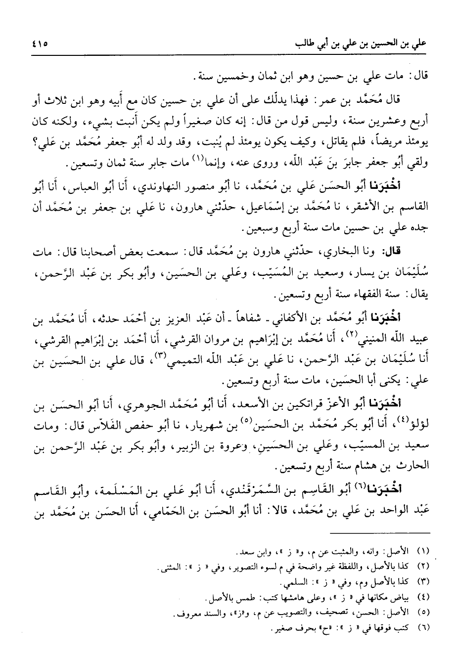 قال مات علي بن حسين وهو ابن ثمان وخمسين سنة قال محمد بن عمر فهذا يدلك على أن علي بن حسين كان مع أبيه وهو ابن ثلاث أو أربع وعشرين سنة وليس قول من قال إنه كان صغيرا ولم يكن أنبت بشئ ولكنه كان يومئذ مريضا فلم يقاتل وكيف يكون يومئذ لم ينبت وقد ولد له أبو جعفر محمد بن علي ولقي أبو جعفر جابر بن عبد الله وروى عنه وإنما (1) مات جابر سنة ثمان وتسعين أخبرنا أبو الحسن علي بن محمد نا أبو منصور النهاوندي أنا أبو العباس أنا أبو القاسم بن الأشقر نا محمد بن إسماعيل حدثني هارون نا علي بن جعفر بن محمد أن جده علي بن حسين مات سنة أربع وسبعين قال ونا البخاري حدثني هارون بن محمد قال سمعت بعض أصحابنا قال مات سليمان بن يسار وسعيد بن المسيب وعلي بن الحسين وأبو بكر بن عبد الرحمن يقال سنة الفقهاء سنة أربع وتسعين أخبرنا أبو محمد بن الأكفاني شفاها أن عبد العزيز بن أحمد حدثه أنا محمد بن عبيد الله المنيني (2) أنا محمد بن إبراهيم بن مروان القرشي أنا أحمد بن إبراهيم القرشي أنا سليمان بن عبد الرحمن نا علي بن عبد الله التميمي (3) قال علي بن الحسين بن علي يكنى أبا الحسين مات سنة أربع وتسعين أخبرنا أبو الأعز قراتكين بن الأسعد أنا أبو محمد الجوهري أنا أبو الحسن بن لؤلؤ (4) أنا أبو بكر محمد بن الحسين (5) بن شهريار نا أبو حفص الفلاس قال ومات سعيد بن المسيب وعلي بن الحسين وعروة بن الزبير وأبو بكر بن عبد الرحمن بن الحارث بن هشام سنة أربع وتسعين أخبرنا (6) أبو القاسم بن السمرقندي أنا أبو علي بن المسلمة وأبو القاسم عبد الواحد بن علي بن محمد قالا أنا أبو الحسن بن الحمامي أنا الحسن بن محمد بن