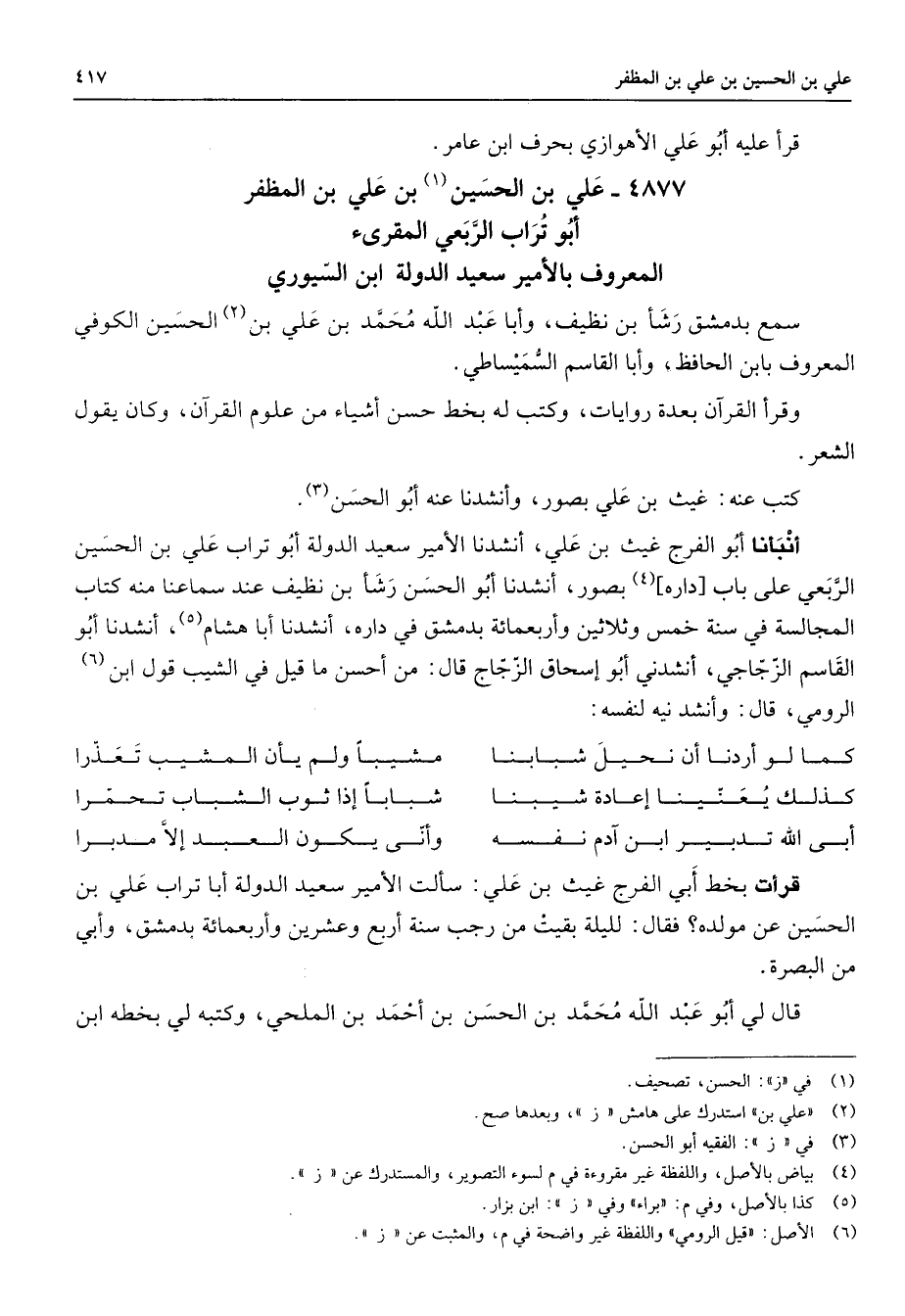 4877 - علي بن الحسين (1) بن علي بن المظفر أبو تراب الربعي المقرئ المعروف بالأمير سعيد الدولة ابن السيوري سمع بدمشق رشأ بن نظيف وأبا عبد الله محمد بن علي بن (2) الحسين الكوفي المعروف بابن الحافظ وأبا القاسم السميساطي وقرأ القرآن بعدة روايات وكتب له بخط حسن أشياء من علوم القرآن وكان يقول الشعر كتب عنه غيث بن علي بصور وأنشدنا عنه أبو الحسن (3) أنبأنا أبو الفرج غيث بن علي أنشدنا الأمير سعيد الدولة أبو تراب علي بن الحسين الربعي على باب داره (4) بصور أنشدنا أبو الحسن رشأ بن نظيف عند سماعنا منه كتاب المجالسة في سنة خمس وثلاثين وأربعمائة بدمشق في داره أنشدنا أبو هشام (5) أنشدنا أبو القاسم الزجاجي أنشدني أبو إسحاق الزجاج قال من أحسن ما قيل في الشيب قول ابن (6) الرومي وأنشدنيه لنفسه * كما لو أردنا أن نحيل شبابنا * مشيبا ولم يأن المشيب تعذرا كذلك يعنينا إعادة شيبنا * شبابا إذا ثوب الشباب تحمرا أبى الله تدبير ابن آدم نفسه * وأنى يكون العبد إلا مدبرا * قرأت بخط أبي الفرج غيث بن علي سألت الأمير سعيد الدولة أبا تراب علي بن الحسين عن مولده فقال لليلة بقيت من رجب سنة أربع وعشرين وأربعمائة بدمشق وأبي من البصرة قال لي أبو عبد الله محمد بن الحسن بن أحمد بن الملحي وكتبه لي بخطه ابن