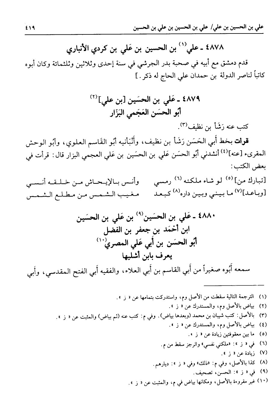 4879 - علي بن الحسين بن علي (2) أبو الحسن العجمي البزار كتب عنه رشأ بن نظيف (3) قرأت بخط أبي الحسن رشأ بن نظيف وأنبأنيه أبو القاسم العلوي وأبو الوحش المقرئ عنه (4) أنشدني أبو الحسن علي بن الحسين بن علي العجمي البزار قال قرأت في بعض الكتب * تبارك من (5) لو شاء ملكته (6) رمسي * وأنس بالإيحاش من خلقه أنسي * وباعد (7) ما بيني وبين داره (8) كبعد * مغيب الشمس من مطلع الشمس *