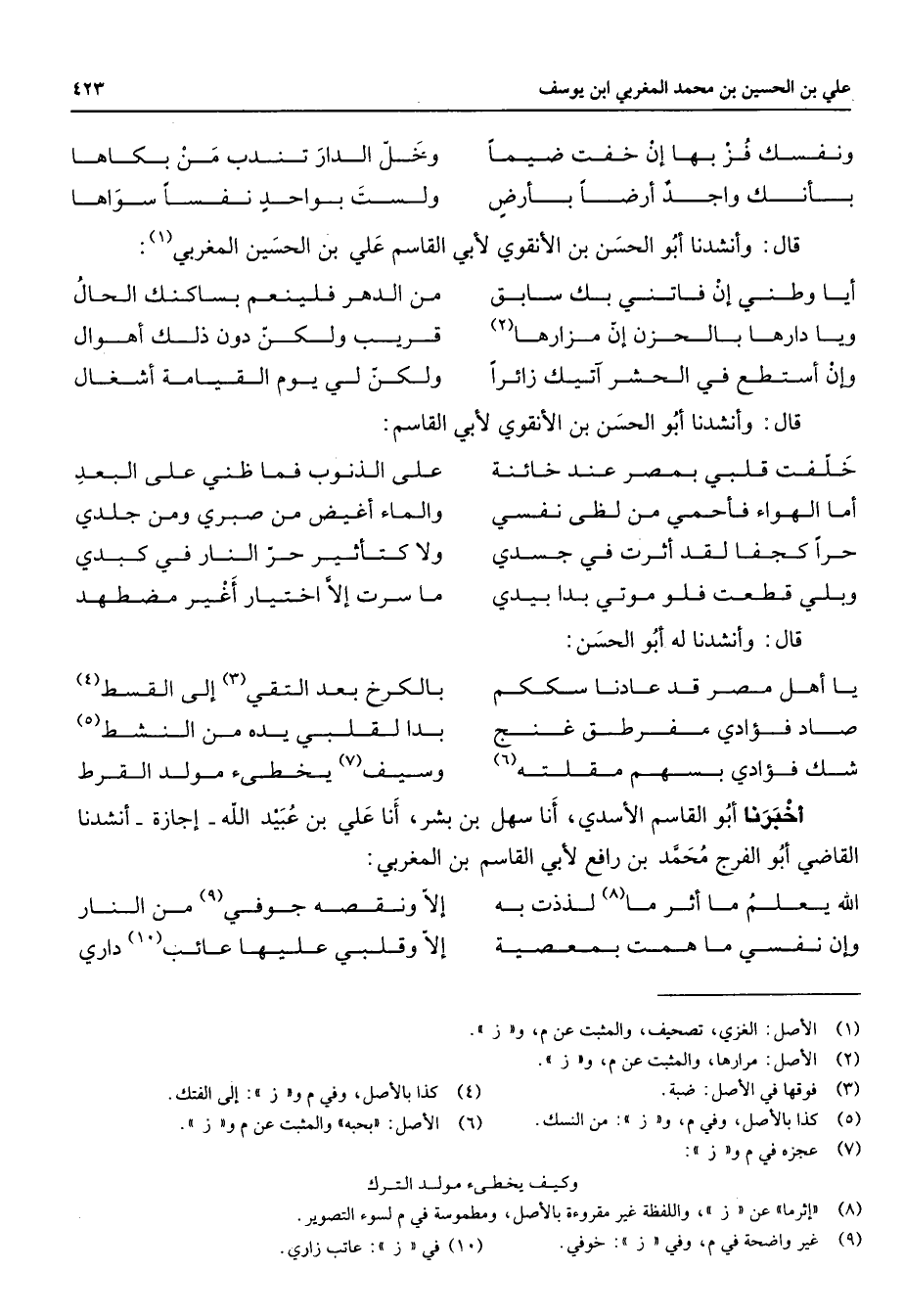 * ونفسك فز بها إن خفت ضيما * وخل الدار تندب من بكاها بأنك واجد أرضا بأرض * ولست بواحد نفسا سواها * قال وأنشدنا أبو الحسن بن الأنقوي لأبي القاسم علي بن الحسين المغربي (1) * أيا وطني إن فاتني بك سابق * من الدهر فلينعم بساكنك الحال ويا دارها بالحزن إن مزارها (2) * قريب ولكن دون ذلك أهوال وإن أستطع في الحشر آتيك زائرا * ولكن لي يوم القيامة أشغال * قال وأنشدنا أبو الحسن بن الأنقوي لأبي القاسم * خلفت قلبي بمصر عند خائنة * على الذنوب فما ظني على البعد أما الهواء فأحمي من لظى نفسي * والماء أغيض من صبري ومن جلدي حرا كجفا لقد أثرت في جسدي * ولا كتأثير حر النار في كبدي وبلي قطعت فلو موتي بدا بيدي * ما سرت إلا اختيار أغير مضطهد * قال وأنشدنا له أبو الحسن * يا أهل مصر قد عادنا سككم * بالكرخ بعد التقي (3) إلى القسط (4) صاد فؤادي مفرطق غنج * بدا لقلبي يده من النشط (5) شك فؤادي بسهم مقلته * (6) وسيف (7) يخطئ مولد القرط * أخبرنا أبو القاسم الأسدي أنا سهل بن بشر أنا علي بن عبيد الله إجازة أنشدنا القاضي أبو الفرج محمد بن رافع لأبي القاسم بن المغربي * الله يعلم ما أثر ما (8) لذذت به * إلا ونقصه جوفي (9) من النار وإن نفسي ما همت بمعصية * إلا وقلبي عليها عائب (10) داري