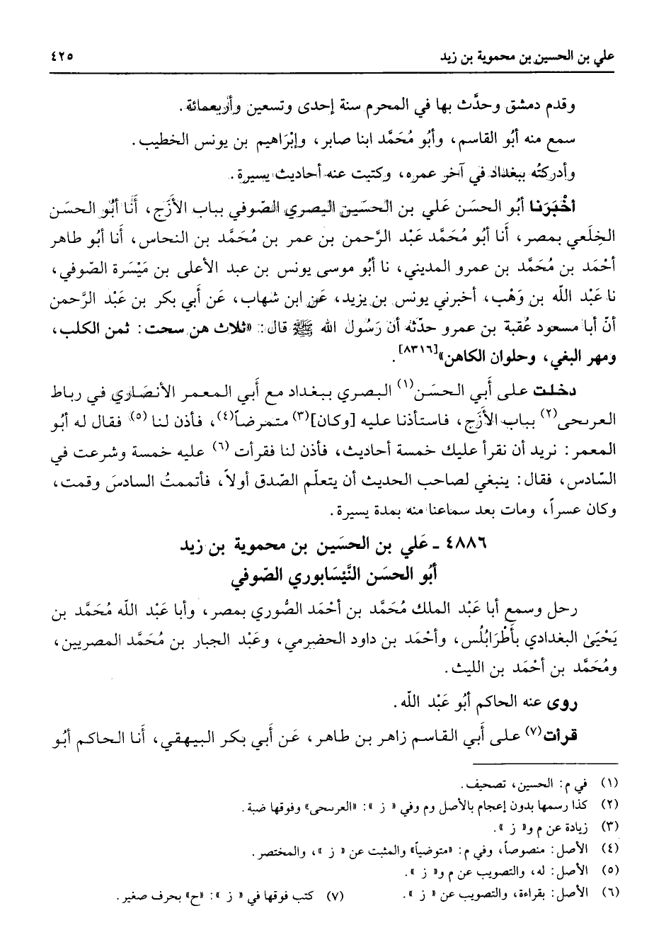 دخلت على أبي الحسن (1) البصري ببغداد مع أبي المعمر الأنصاري في رباط العرنجي (2) بباب الأزج فاستأذنا عليه وكان (3) متمرضا (4) فأذن لنا (5) فقال له أبو المعمر نريد أن نقرأ عليك خمسة أحاديث فأذن لنا فقرأت (6) عليه خمسة وشرعت في السادس فقال ينبغي لصاحب الحديث أن يتعلم الصدق أولا فأتممت السادس وقمت وكان عسرا ومات بعد سماعنا بن الحسين بن محموية بن زيد أبو الحسن النيسابوري الصوفي رحل وسمع أبا عبد الملك محمد بن أحمد الصوري بمصر وأبا عبد الله محمد بن يحيى البغدادي بأطرابلس وأحمد بن داود الحضرمي وعبد الجبار بن محمد المصريين ومحمد بن أحمد بن الليث روى عنه الحاكم أبو عبد الله قرأت (7) على أبي القاسم زاهر بن طاهر عن أبي بكر البيهقي أنا الحاكم أبو