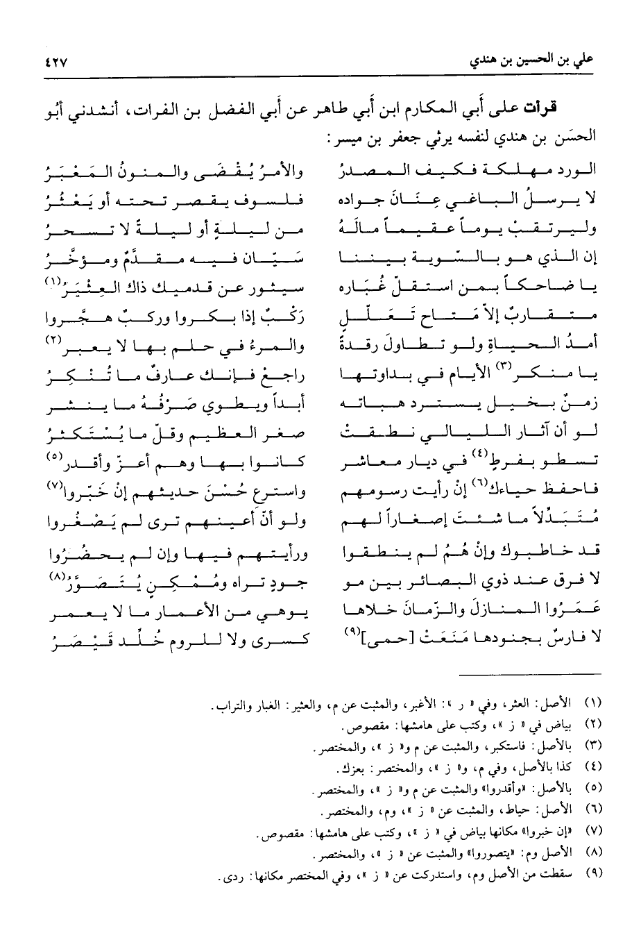 قرأت على أبي المكارم ابن أبي طاهر عن أبي الفضل بن الفرات أنشدني أبو الحسن بن هندي لنفسه يرثي جعفر بن ميسر * الورد مهلكة فكيف المصدر * والأمر يقضى والمنون المعبر لا يرسل الباغي عنان جواده * فلسوف يقصر تحته أو يعثر وليرتقب يوما عقيما ماله * من ليلة أو ليلة لا تسحر إن الذي هو بالسوية بيننا * سيان فيه مقدم ومؤخر يا ضاحكا بمن استقل غباره * سيثور عن قدميك ذاك العثير (1) متقارب إلا متاح تعلل * ركب إذا بكروا وركب هجروا أمد الحياة ولو تطاول رقدة * والمرء في حلم بها لا يعبر (2) يا منكر (3) الأيام في بداوتها * راجع فإنك عارف ما تنكر زمن بخيل يسترد هباته * أبدا ويطوي صرفه ما ينشر لو أن آثار الليالي نطقت * صغر العظيم وقل ما يستكثر تسطو بفرط (4) في ديار معاشر * كانوا بها وهم أعز وأقدر (5) فاحفظ حياءك (6) إن رأيت رسومهم * وأسترع حسن حديثهم إن خبروا (7) متبدلا ما شئت إصغارا لهم * ولو أن أعينهم ترى لم يصغروا قد خاطبوك وإن هم لم ينطقوا * ورأيتهم فيها وإن لم يحضروا لا فرق عند ذوي البصائر بين مو * جود تراه وممكن يتصور (8) عمروا المنازل والزمان خلاها * يوهي من الأعمار ما لا يعمر لا فارس بجنودها منعت حمى (9) * كسرى ولا للروم خلد قيصر
