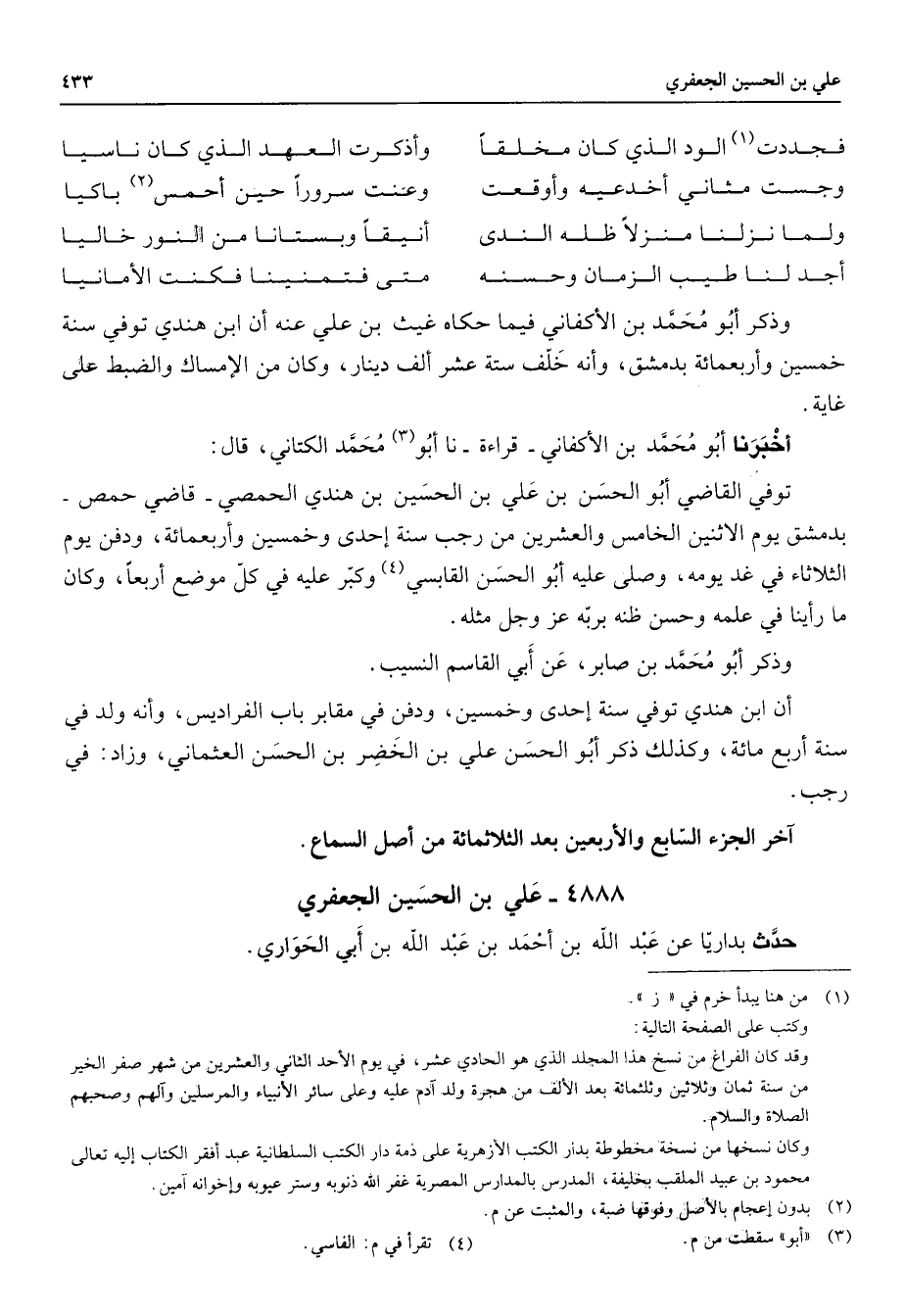 فجددت (1) الود الذي كان مخلقا * وأذكرت العهد الذي كان ناسيا وجست مثاني أخدعيه وأوقعت * وعنت سرورا حين أحمس (2) باكيا ولما نزلنا منزلا ظله الندى * أنيقا وبستانا من النور خاليا أجد لنا طيب الزمان وحسنه * متى فتمنينا فكنت الأمانيا * وذكر أبو محمد بن الأكفاني فيما حكاه غيث بن علي عنه أن أبن هندي توفي سنة خمسين وأربعمائة بدمشق وأنه خلف ستة عشرة ألف دينار وكان من الإمساك والضبط على غاية أخبرنا أبو محمد بن الأكفاني قراءة نا أبو (3) محمد الكتاني قال توفي القاضي أبو الحسن بن علي بن الحسين بن هندي الحمصي قاضي حمص بدمشق يوم الإثنين الخامس والعشرين من رجب سنة إحدى وخمسين وأربعمائة ودفن يوم الثلاثاء في غد يومه وصلى عليه أبو الحسن القابسي (4) وكبر عليه في كل موضع أربعا وكان ما رأينا في علمه وحسن ظنه بربه عز وجل مثله وذكر أبو محمد بن صابر عن أبي القاسم النسيب أن ابن هندي توفي سنة إحدى وخمسين ودفن في مقابر باب الفراديس وأنه ولد في سنة أربع مائة وكذلك ذكر أبو الحسن علي بن الخضر بن الحسن العثماني وزاد في رجب آخر الجزء السابع والأربعين بعد الثلاثمائة من أصل السماع